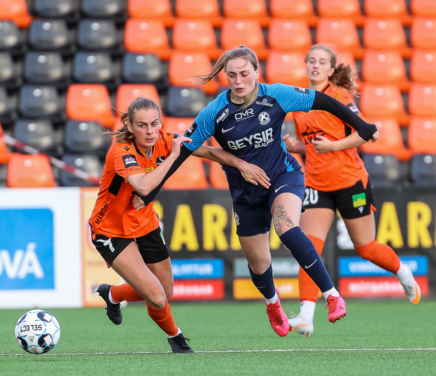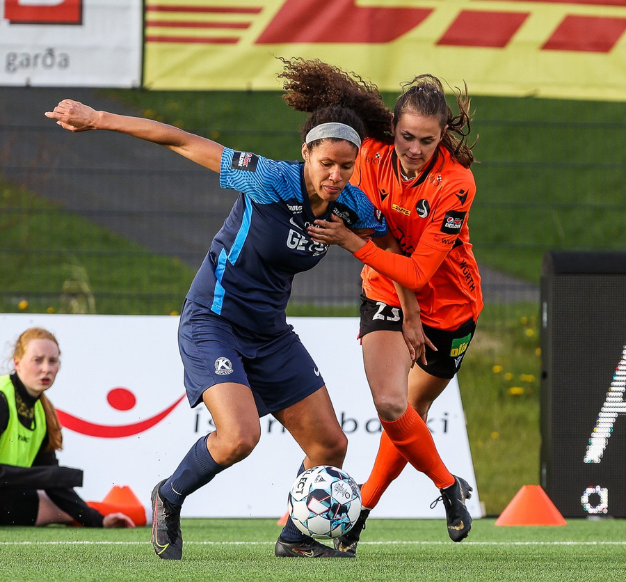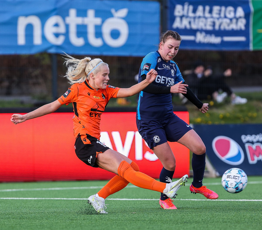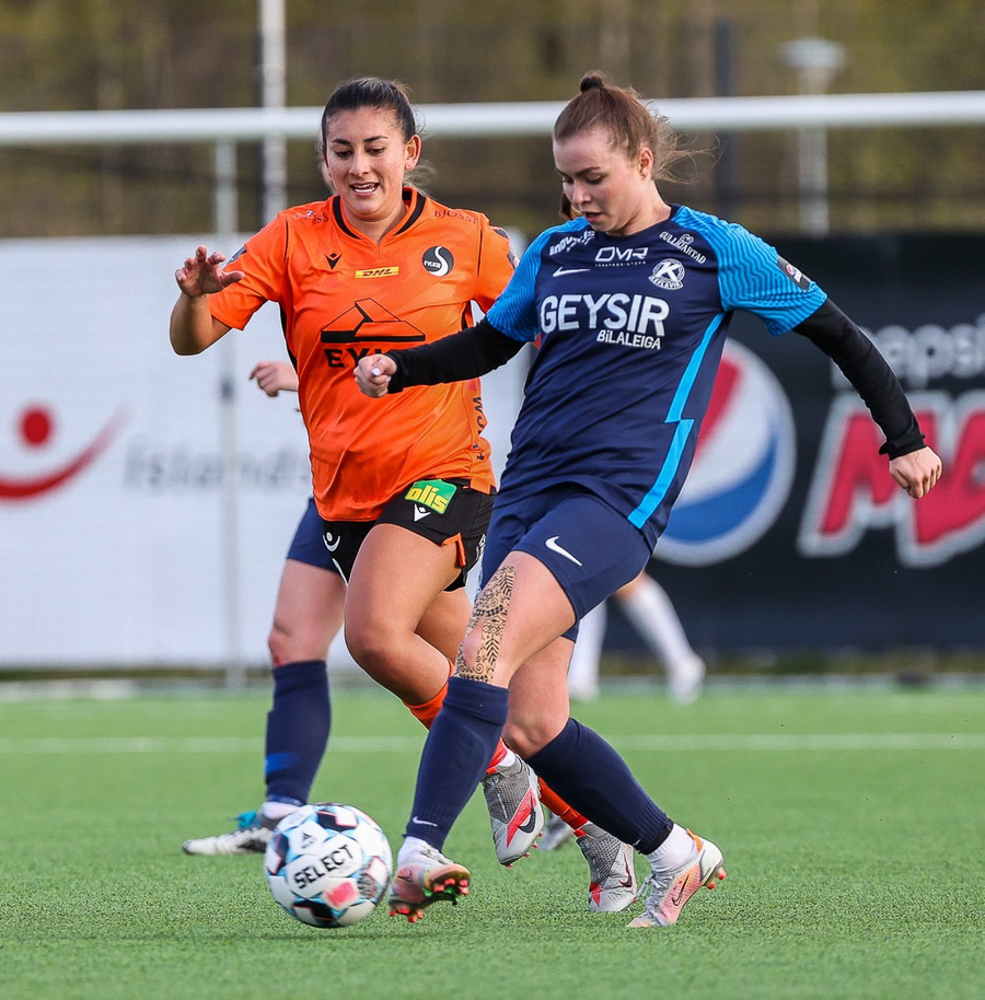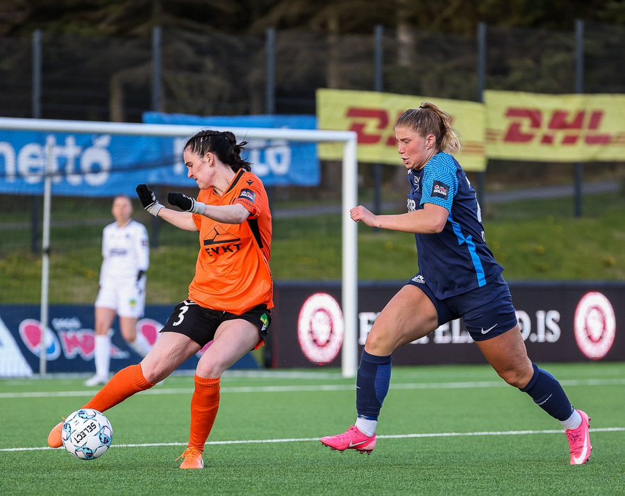 Hulda Hrund með fínan sprett og gott skot en Tiffany vel staðsett og handsamar boltann.