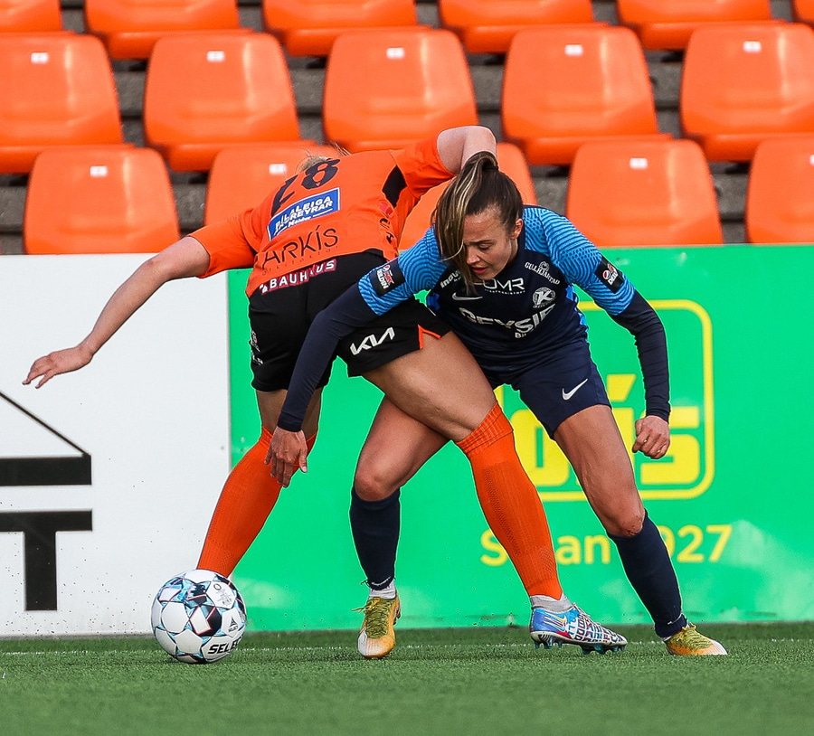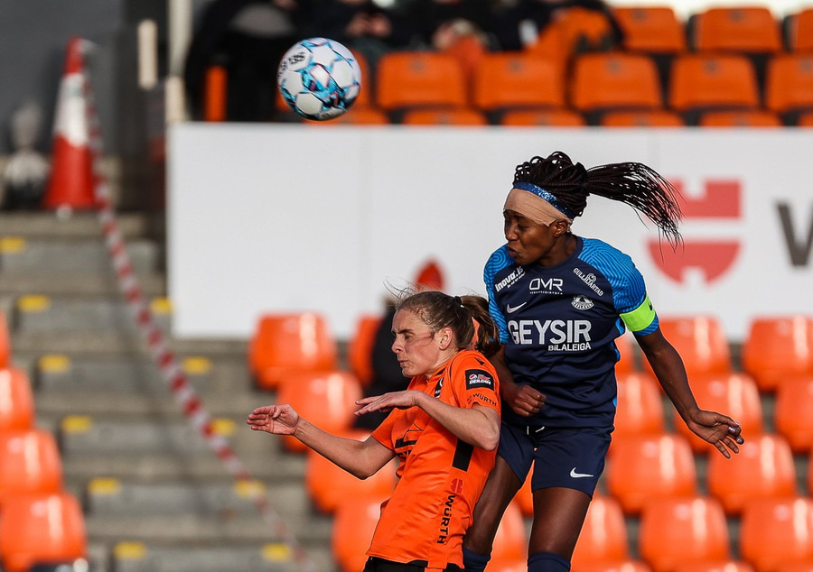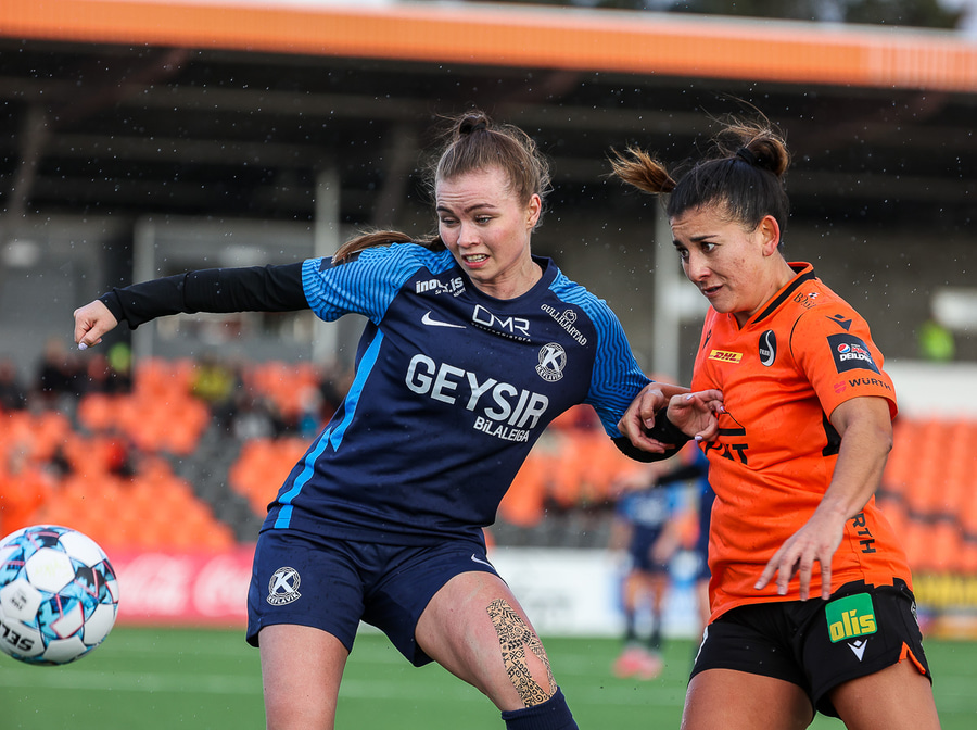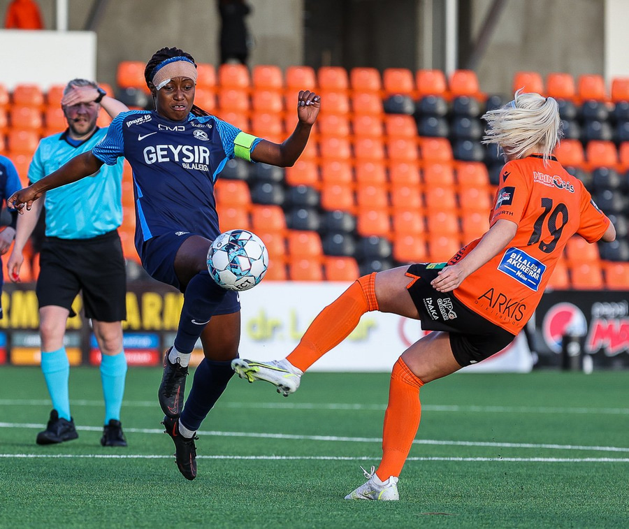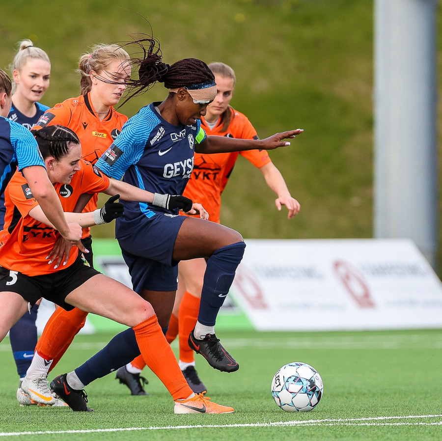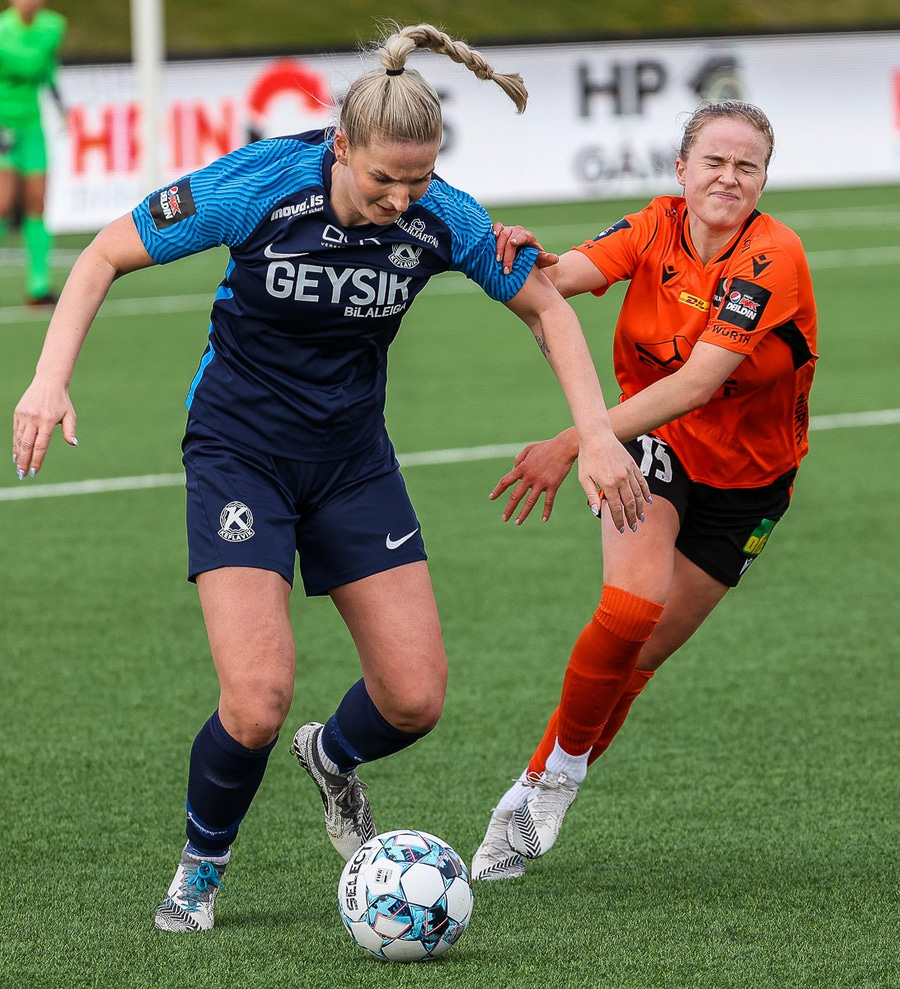Hulda Hrund með fínan sprett og gott skot en Tiffany vel staðsett og handsamar boltann.