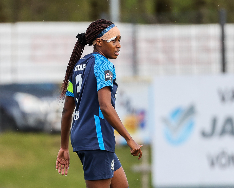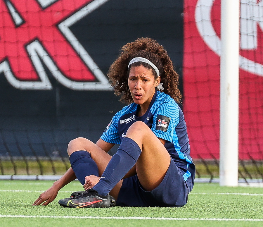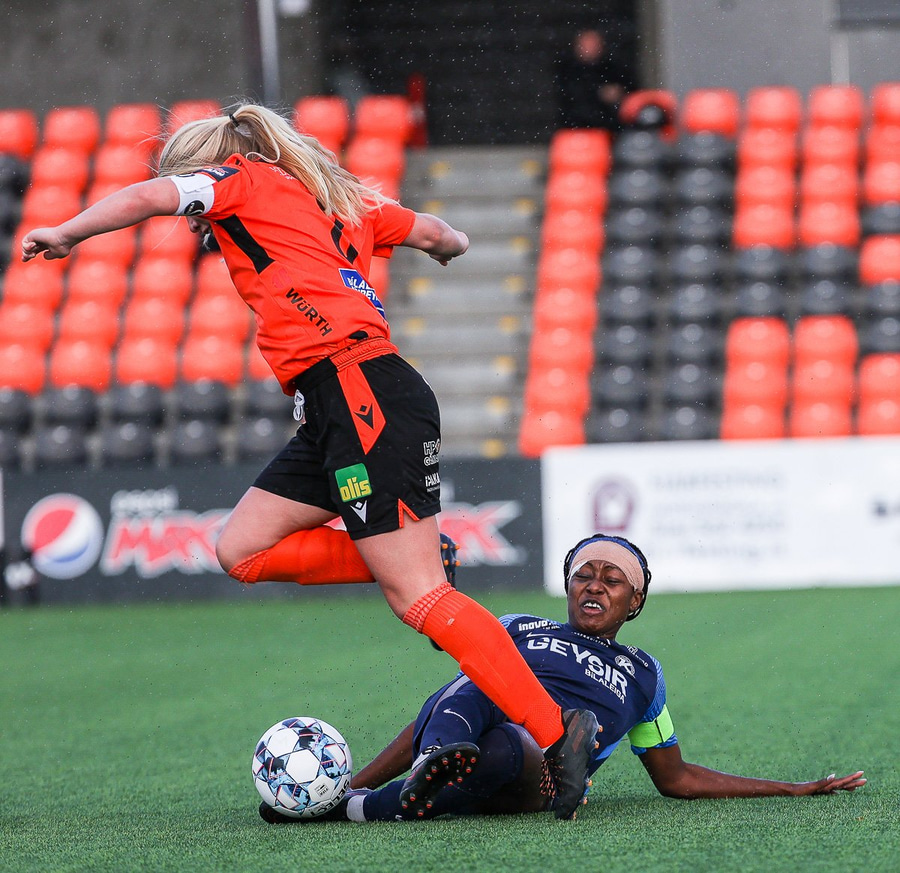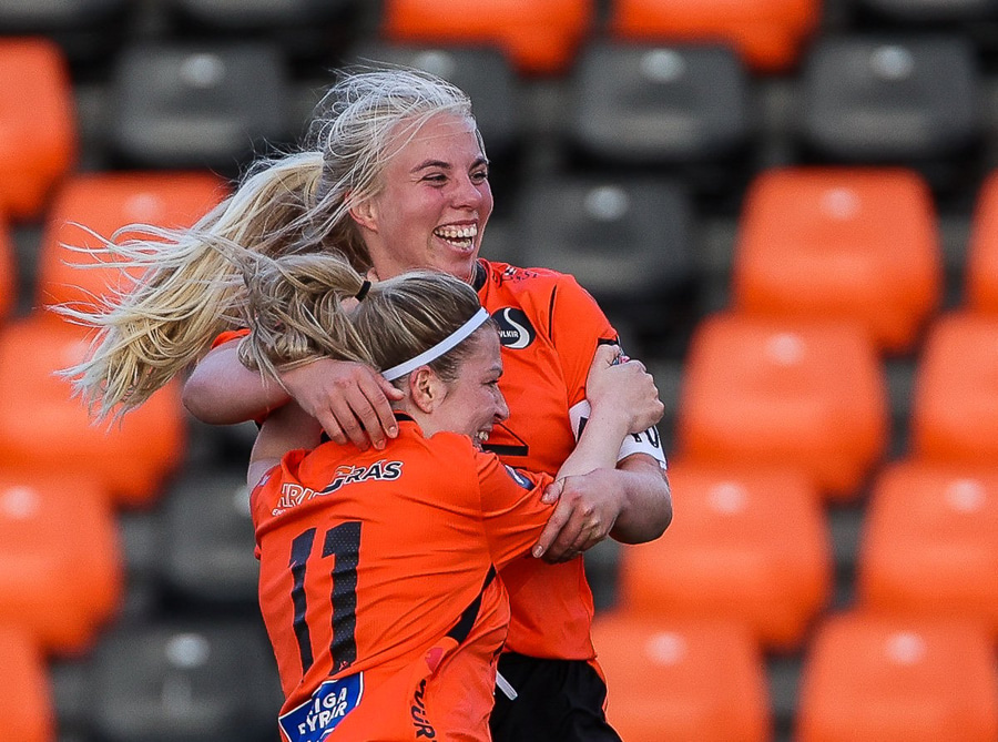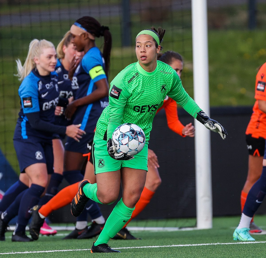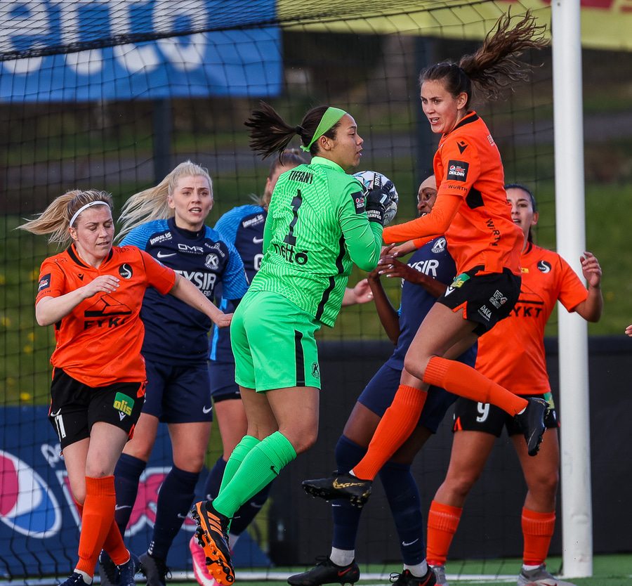 Eftir fína sókn fær Shannon boltann í teignum og á skot í varnarmann sem fer í háum boga yfir Tiffany sem var mætt langt út. Tiffany við það ná boltanum en slær boltann í stöngina og inn.