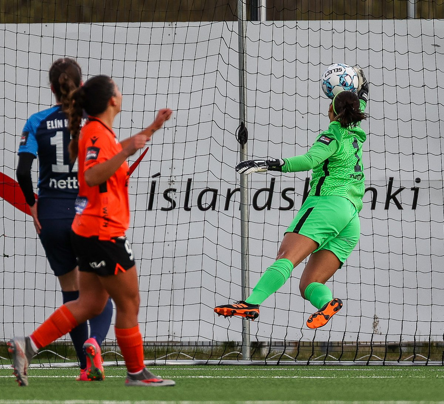 Frábær sending inn á teig gestanna sem að Helena Ósk nær ekki að taka með sér og Tiffany mætir og hirðir boltann.