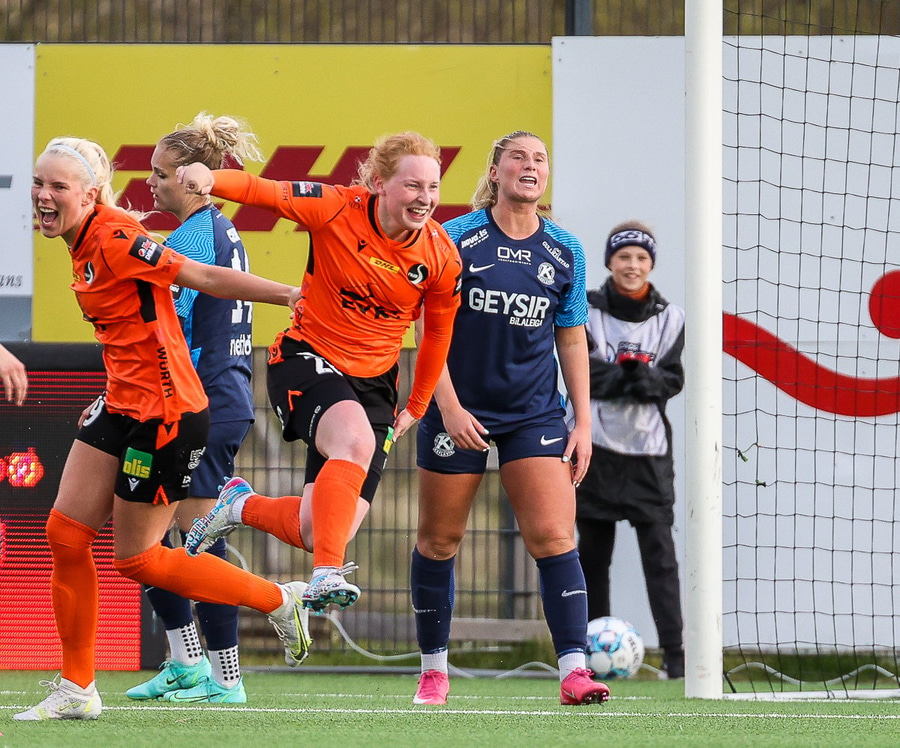 Þórdís fær boltann á miðjum vellinum og keyrir í átt að marki. Lætur vaða af löngu færi og boltinn syngur í netinu.