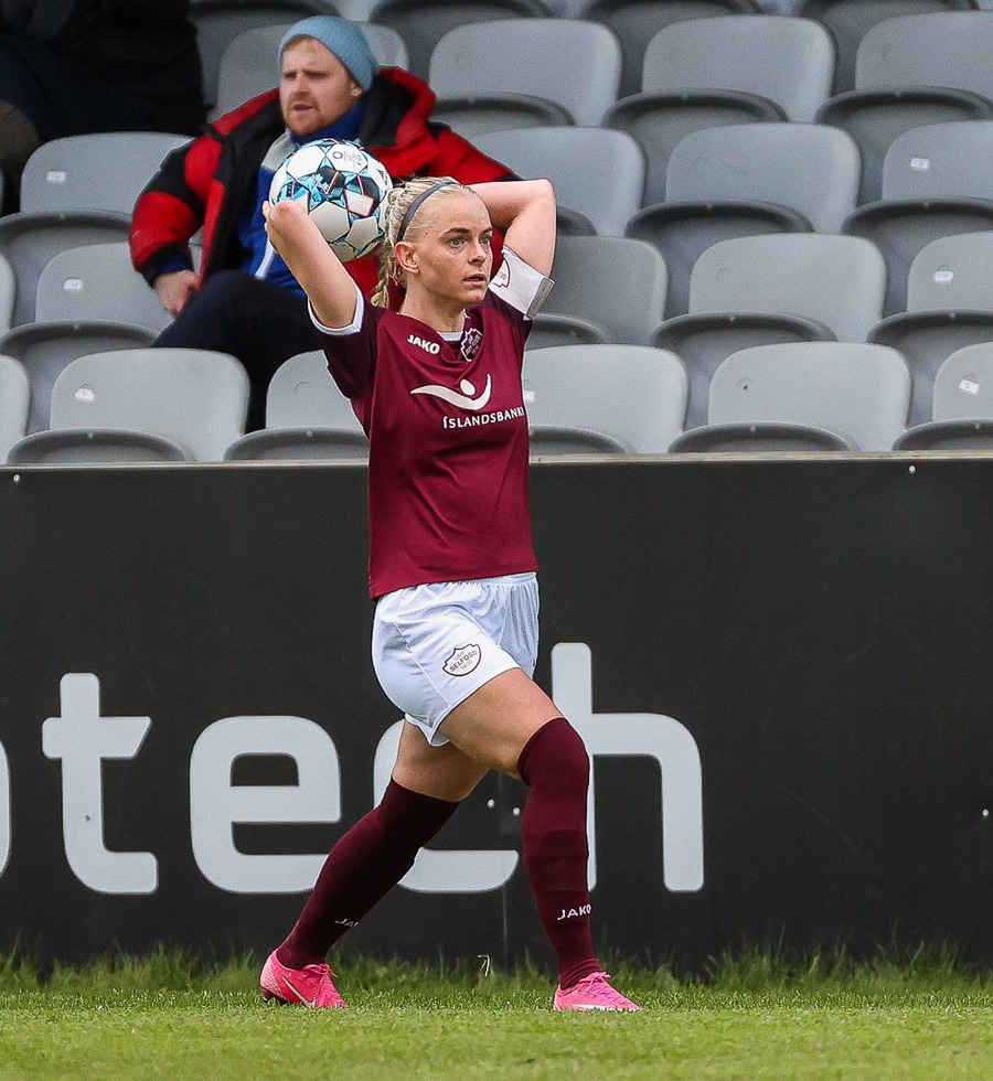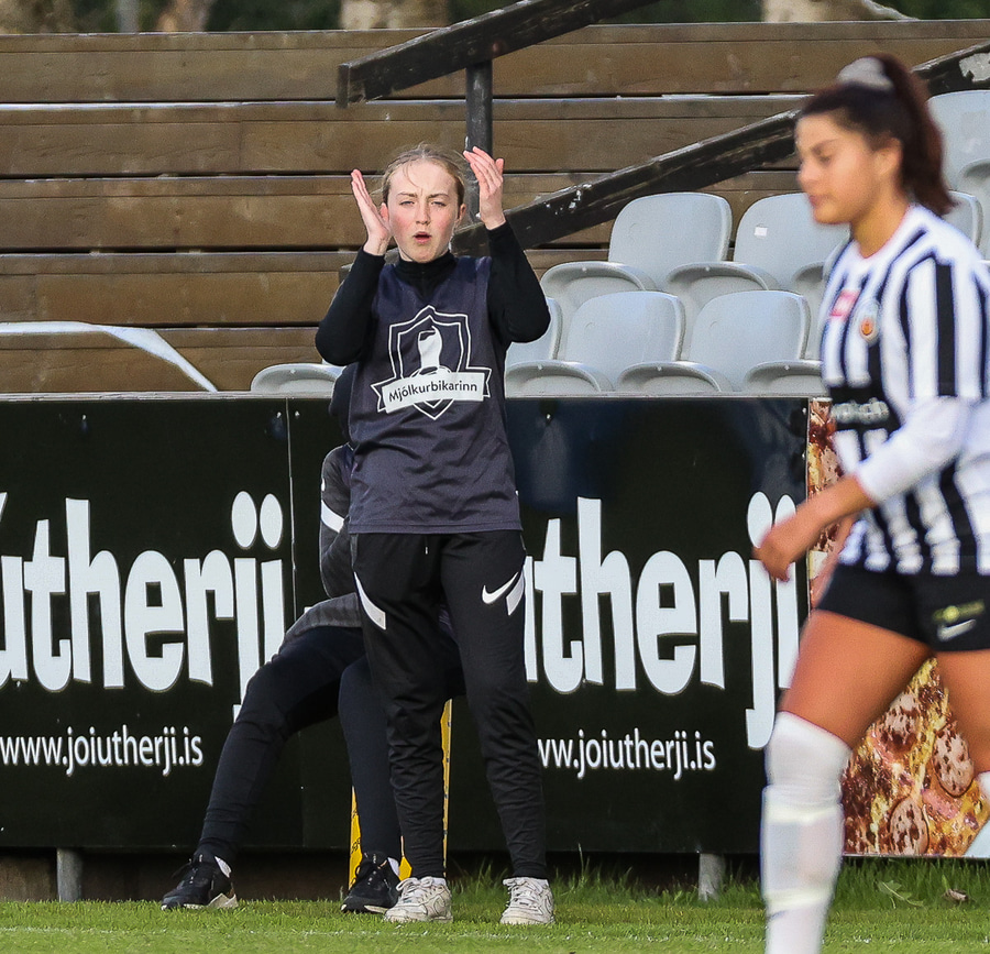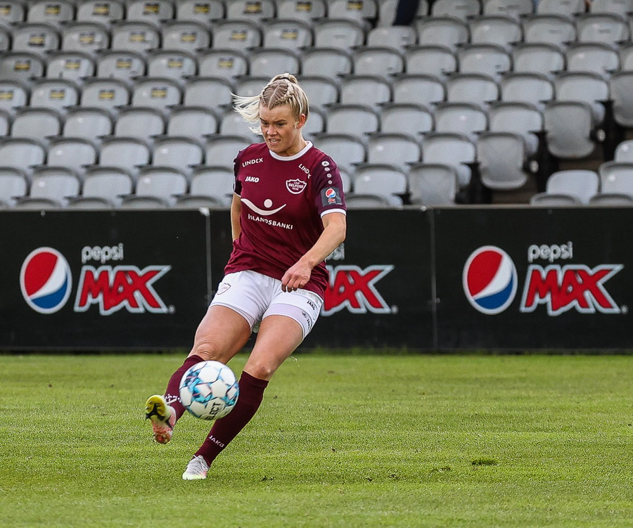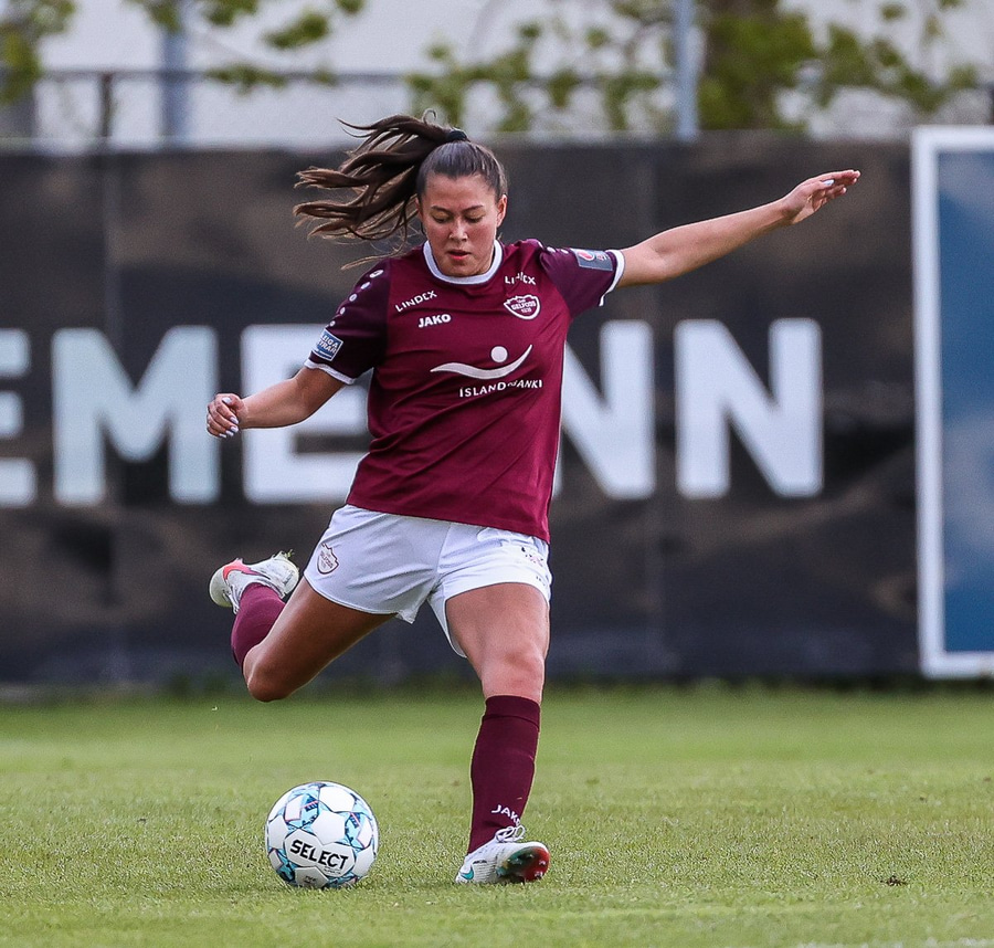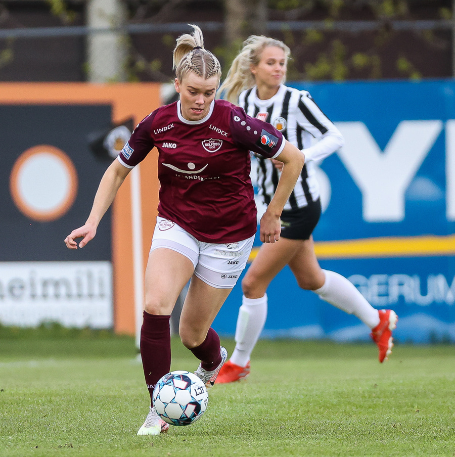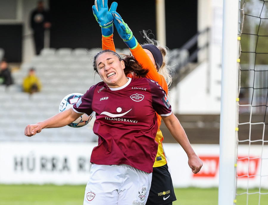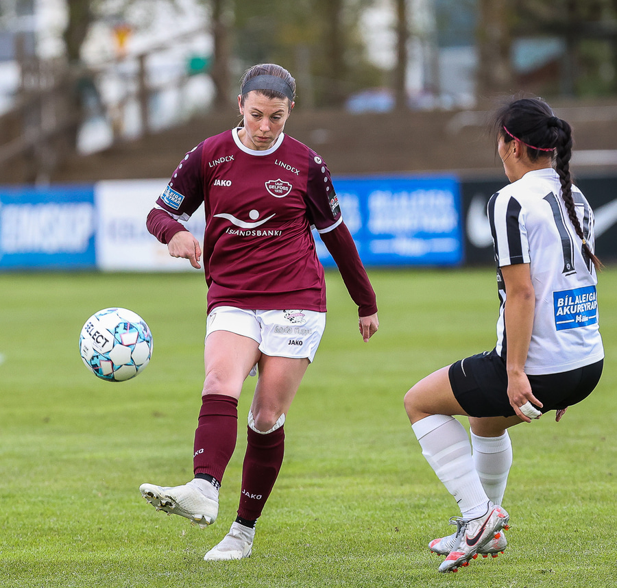 Brenna fær boltann inn í teig og sparkar með hælnum rétt framhjá