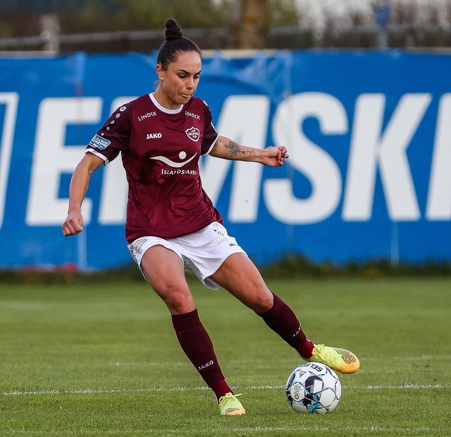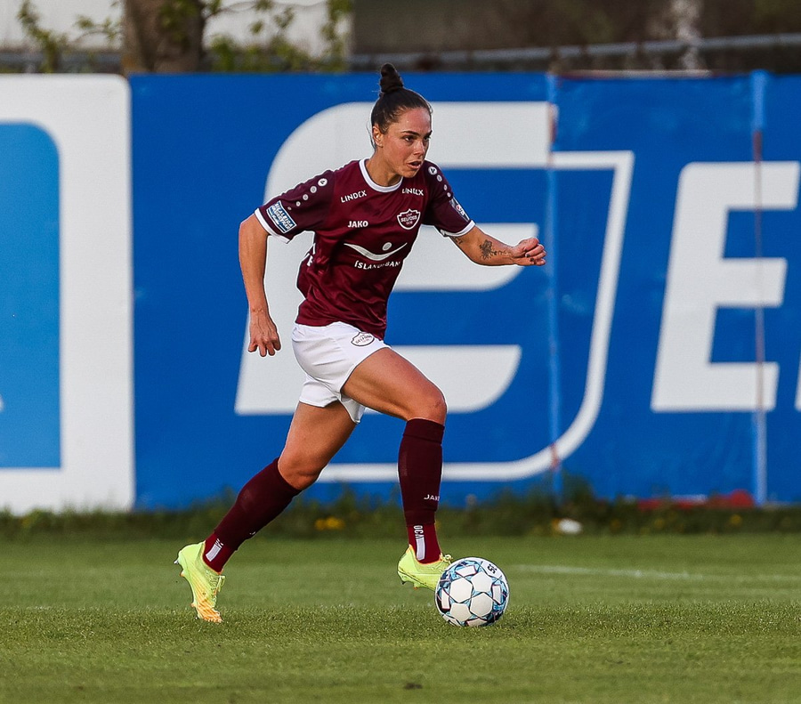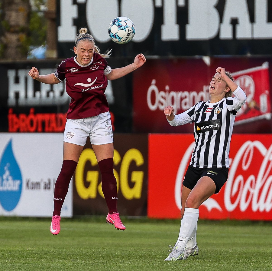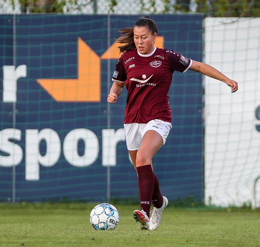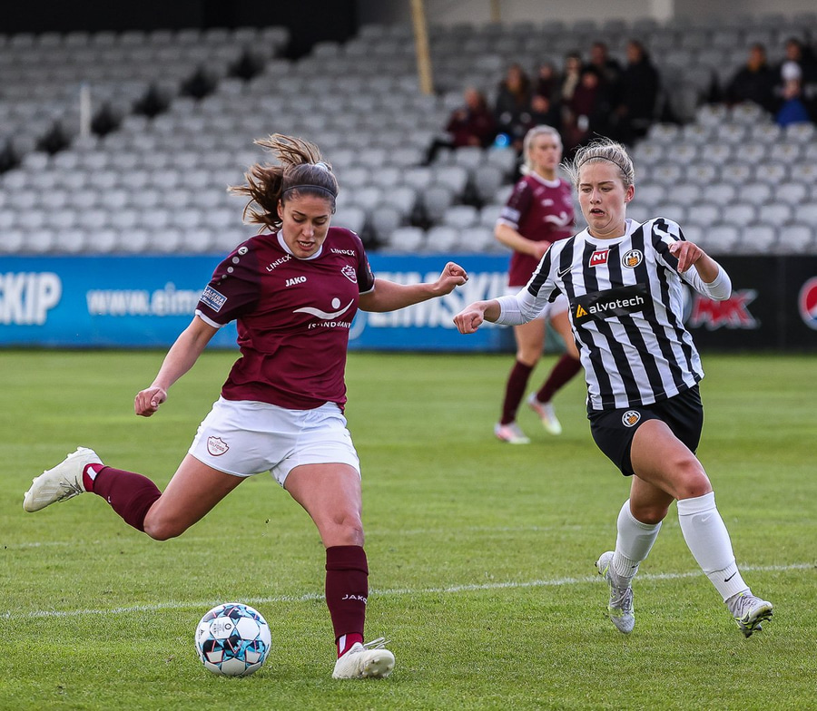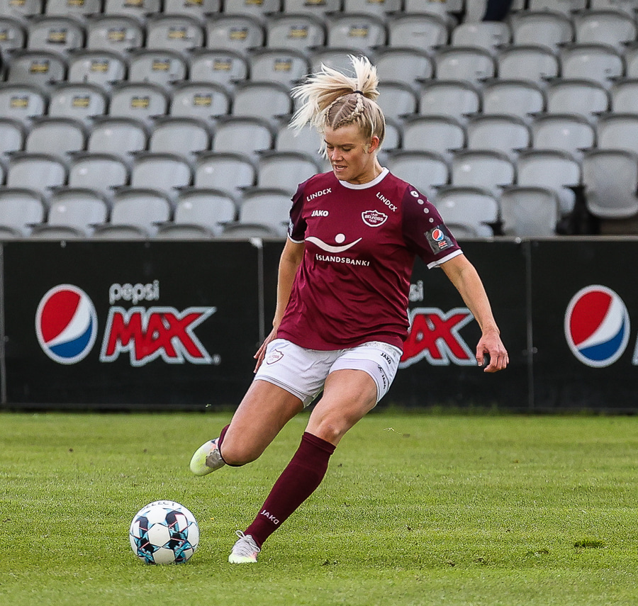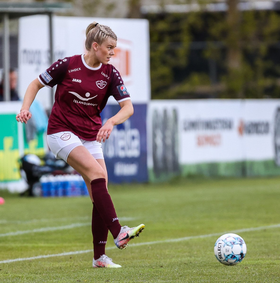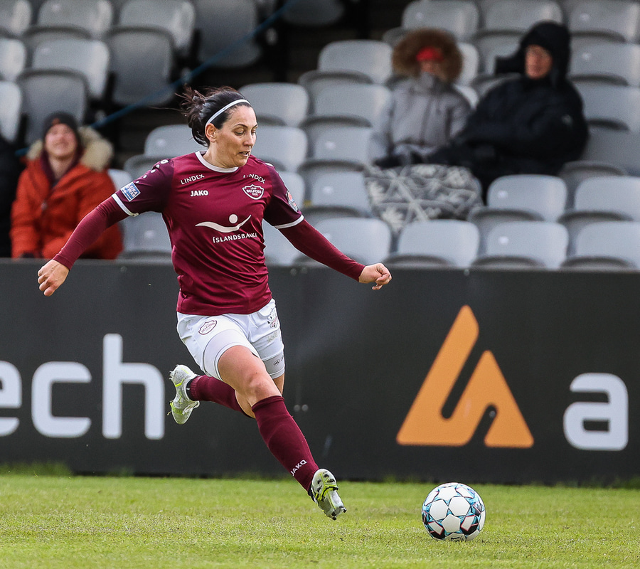 Brenna fær boltann inn í teig og sparkar með hælnum rétt framhjá