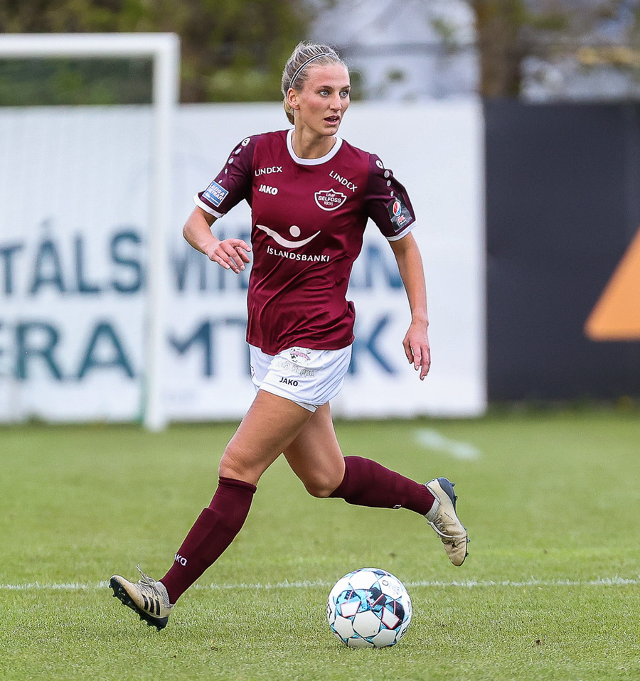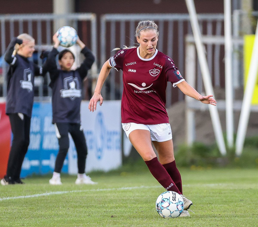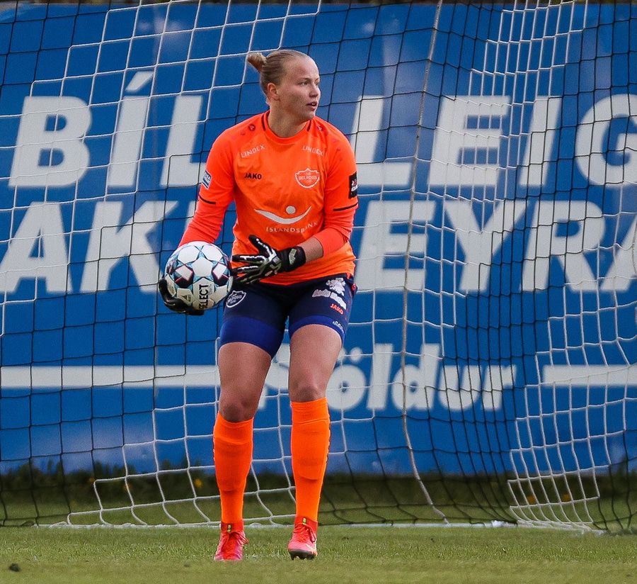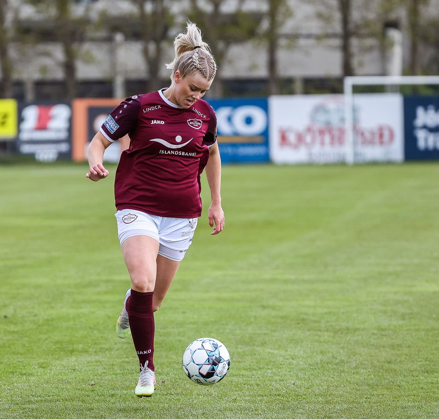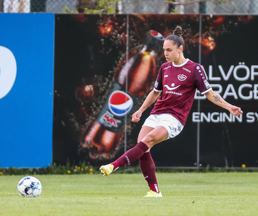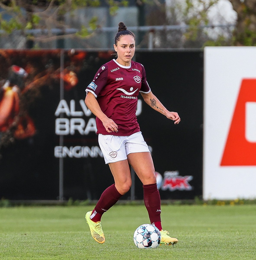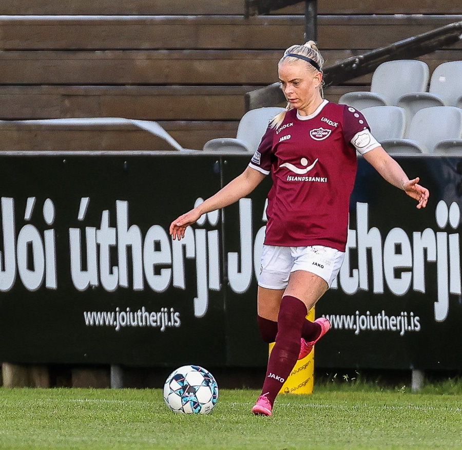 Brenna fær boltann inn í teig og sparkar með hælnum rétt framhjá