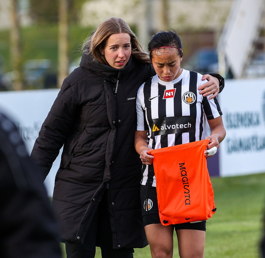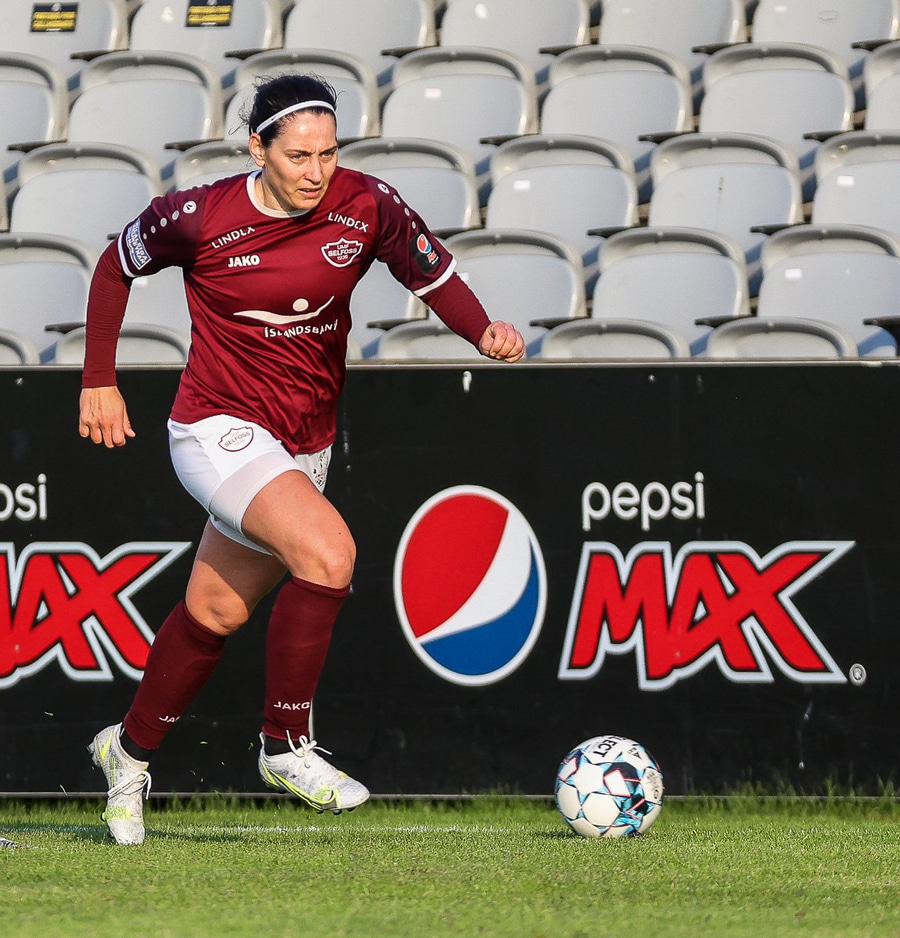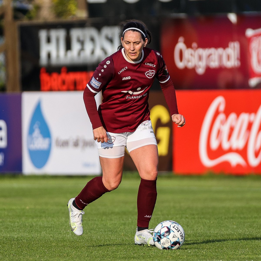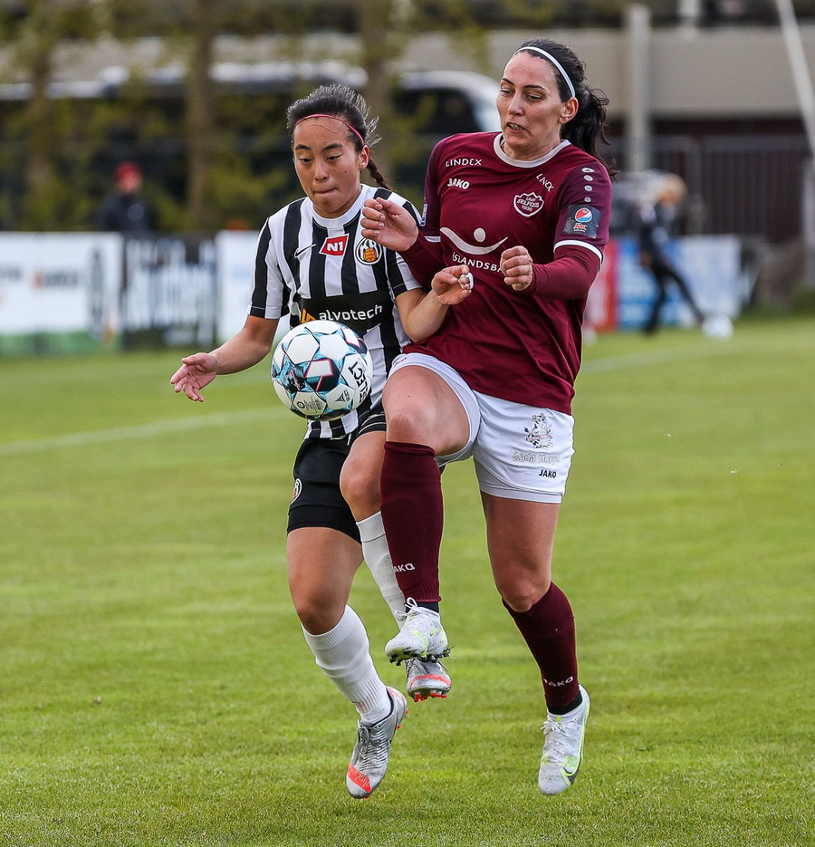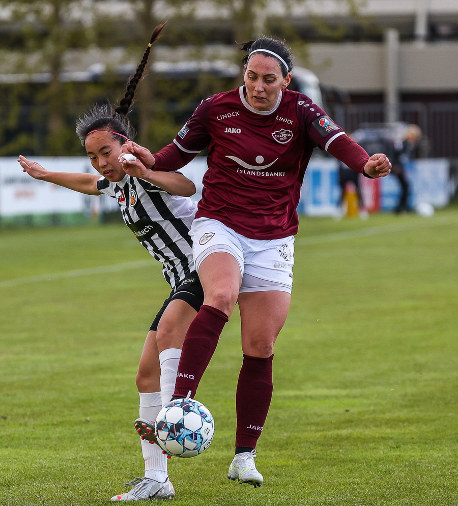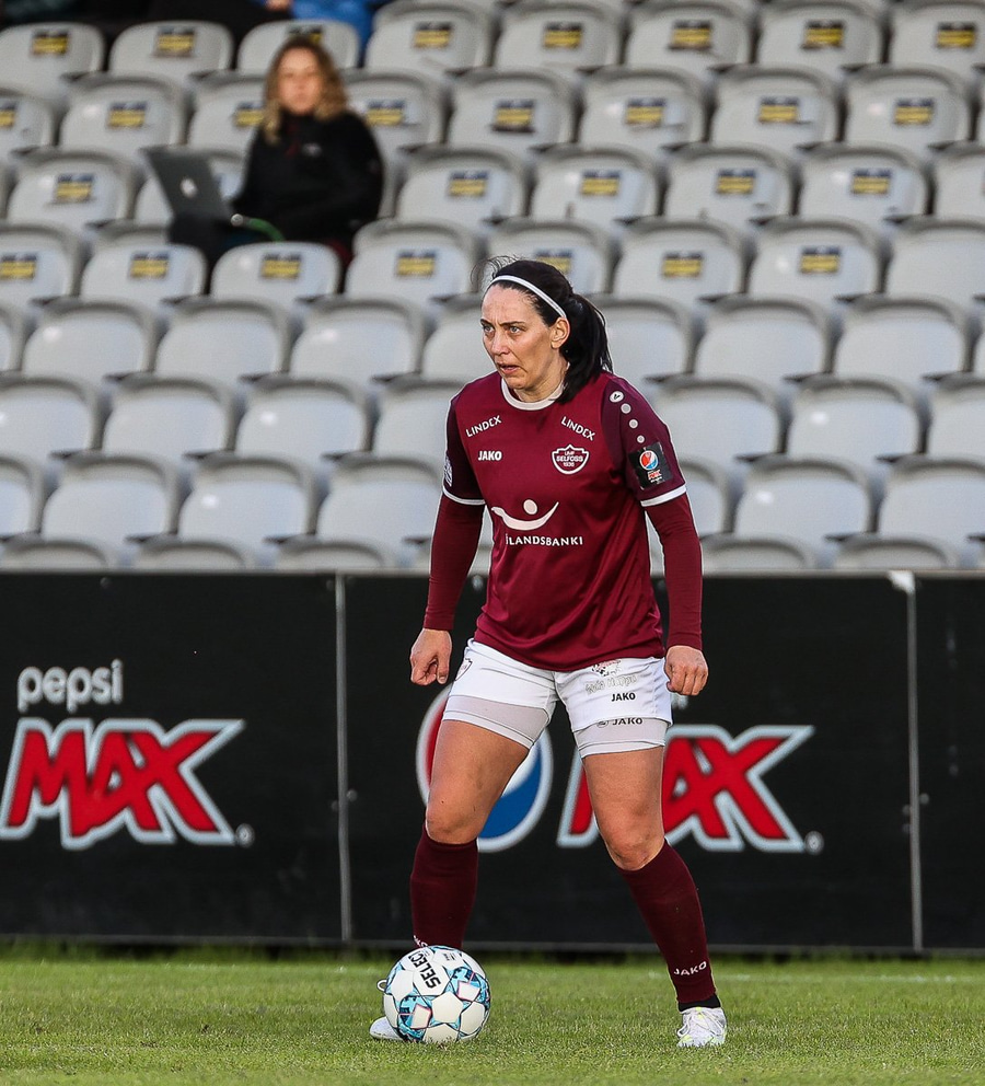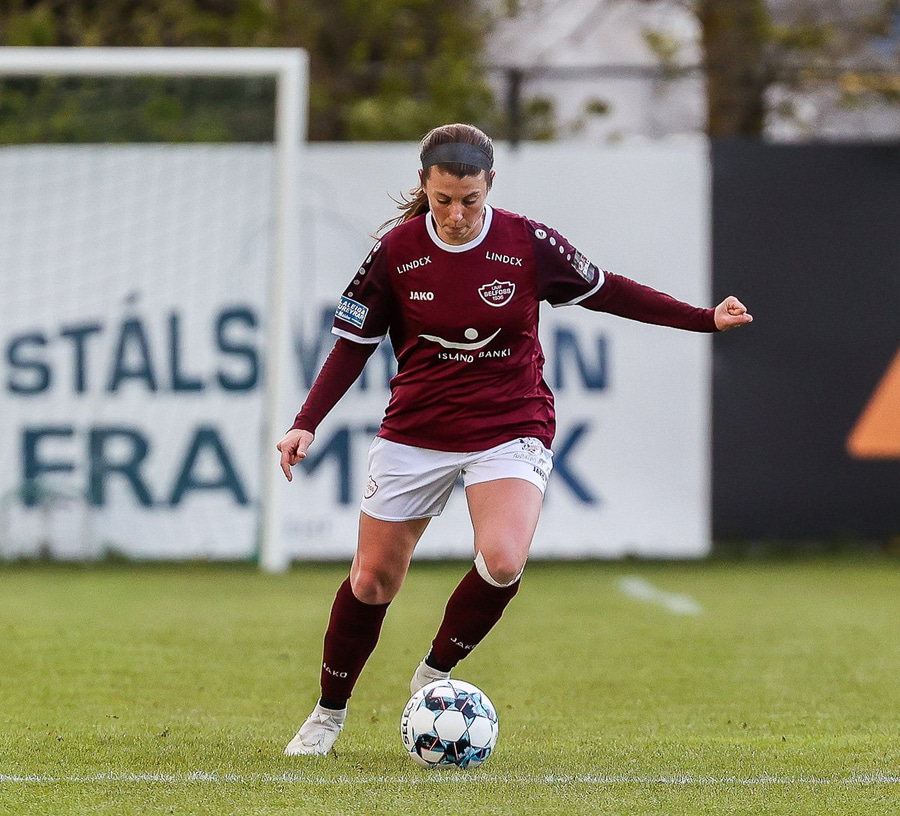 Brenna fær boltann inn í teig og sparkar með hælnum rétt framhjá