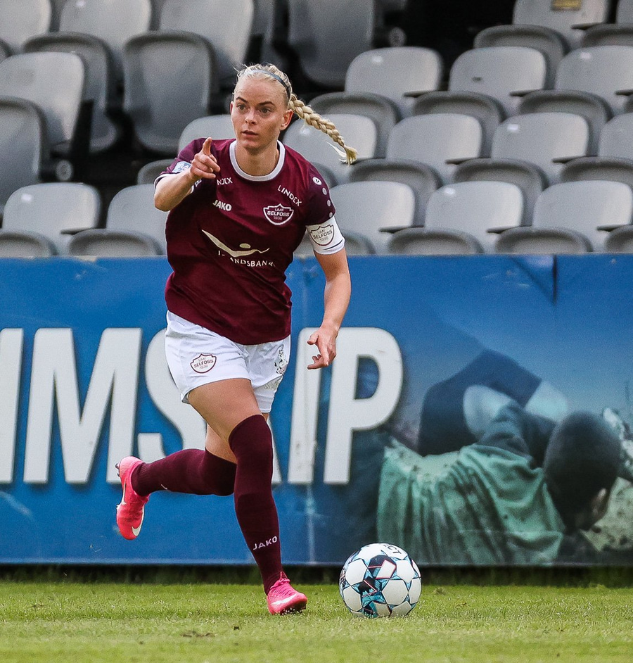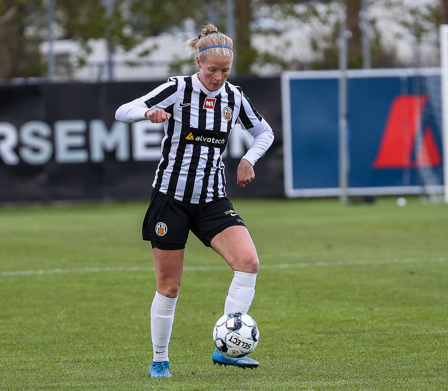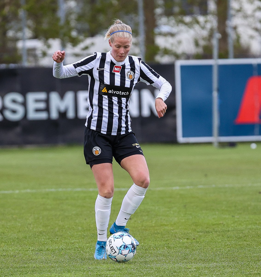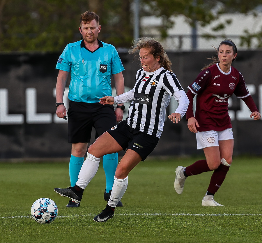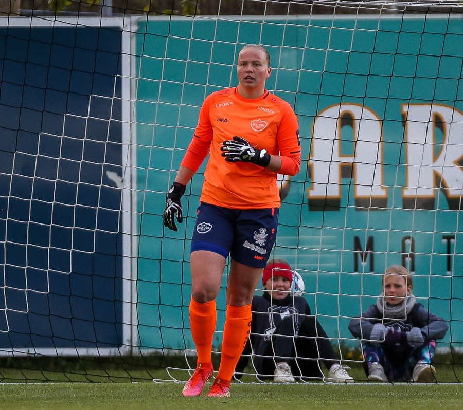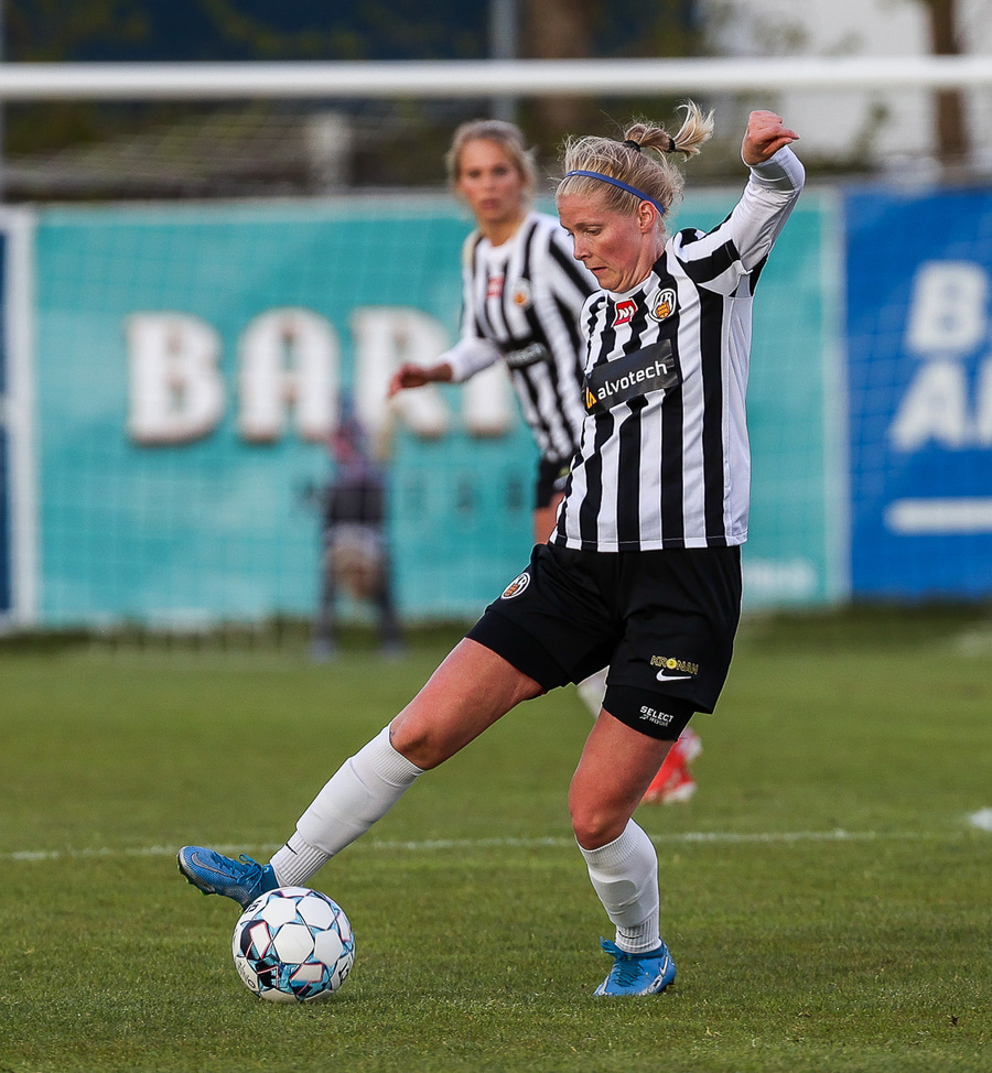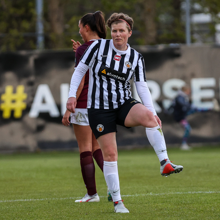 Brenna fær boltann inn í teig og sparkar með hælnum rétt framhjá