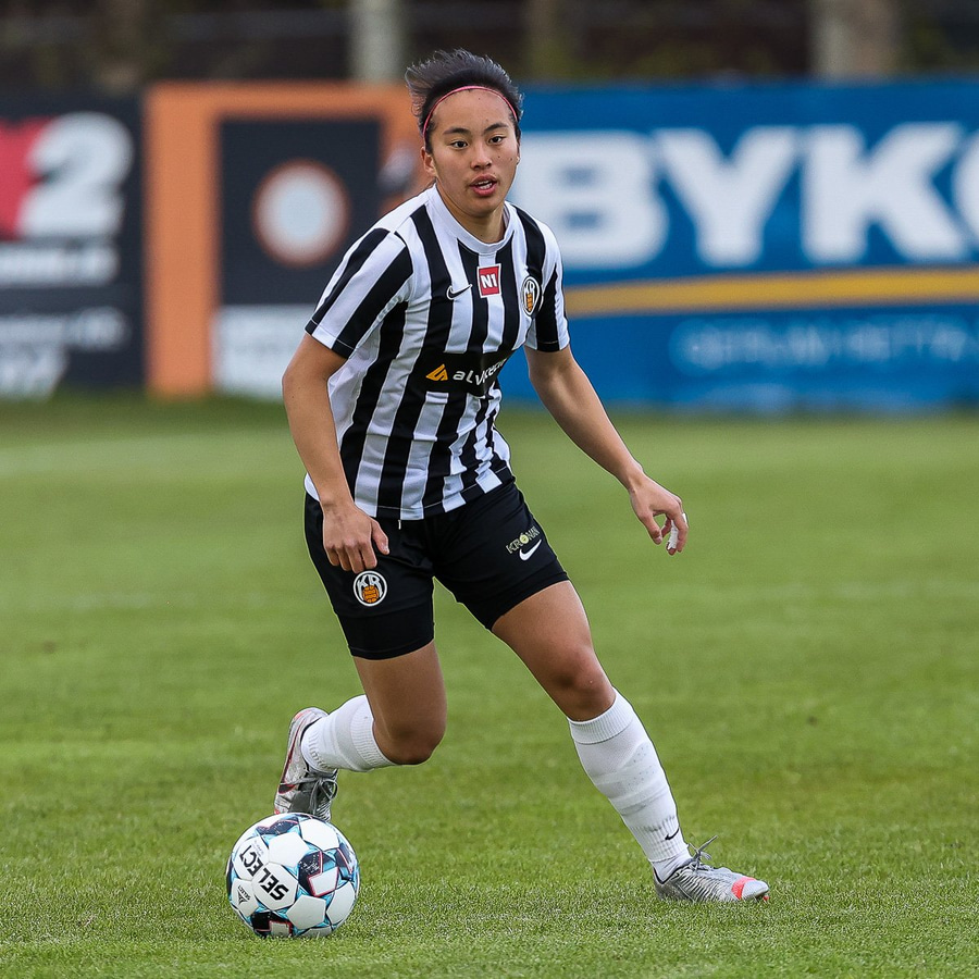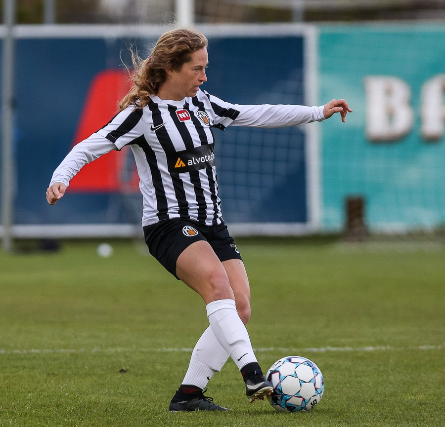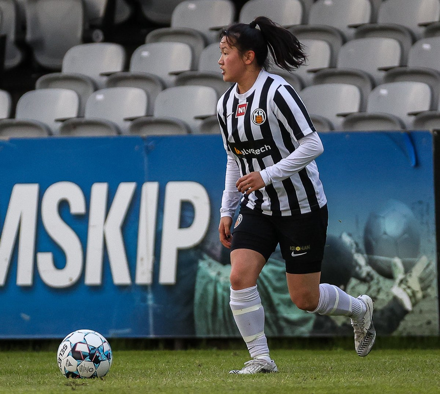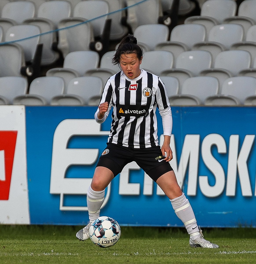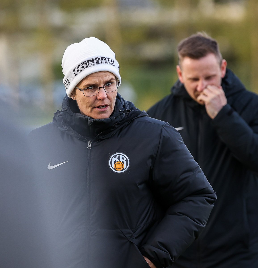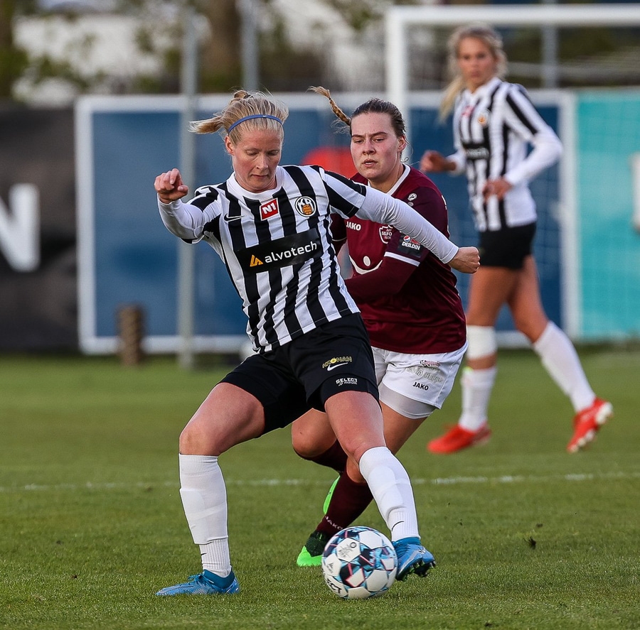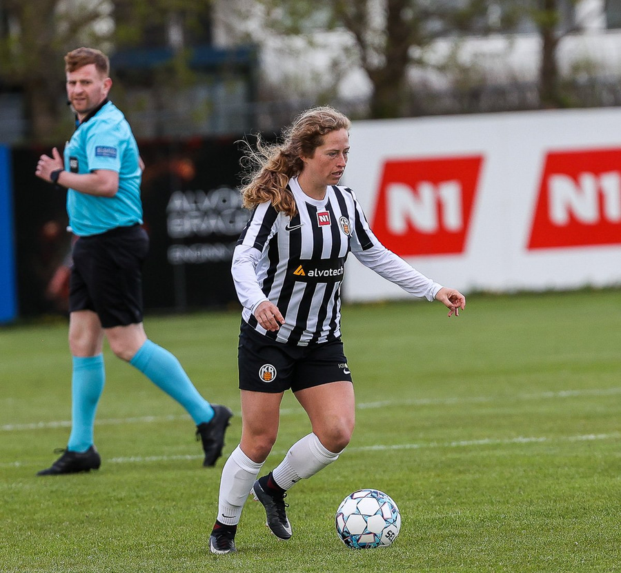 Brenna fær boltann inn í teig og sparkar með hælnum rétt framhjá