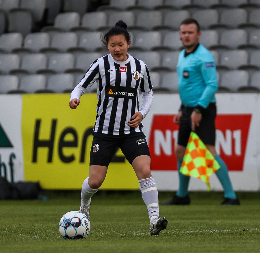 Þarna munaði litlu, eftir hornspyrnuna verður mikill darraðardans sem endar með því að boltinn berst út til Laufeyjar sem tekur skotið en það fer rétt framhjá markinu