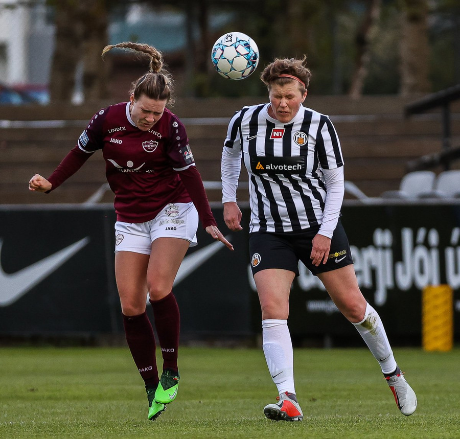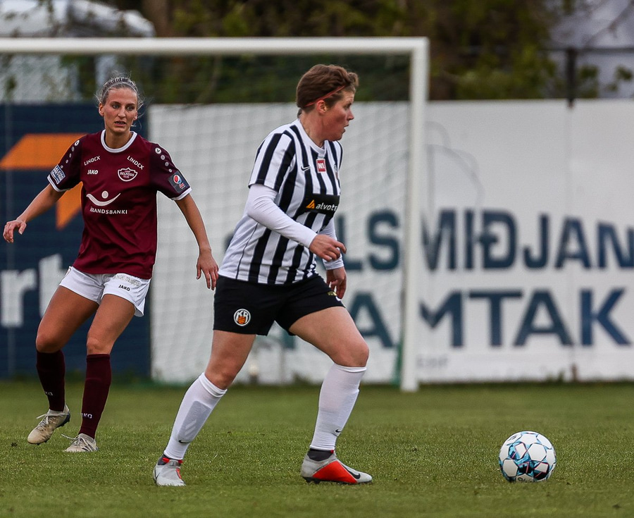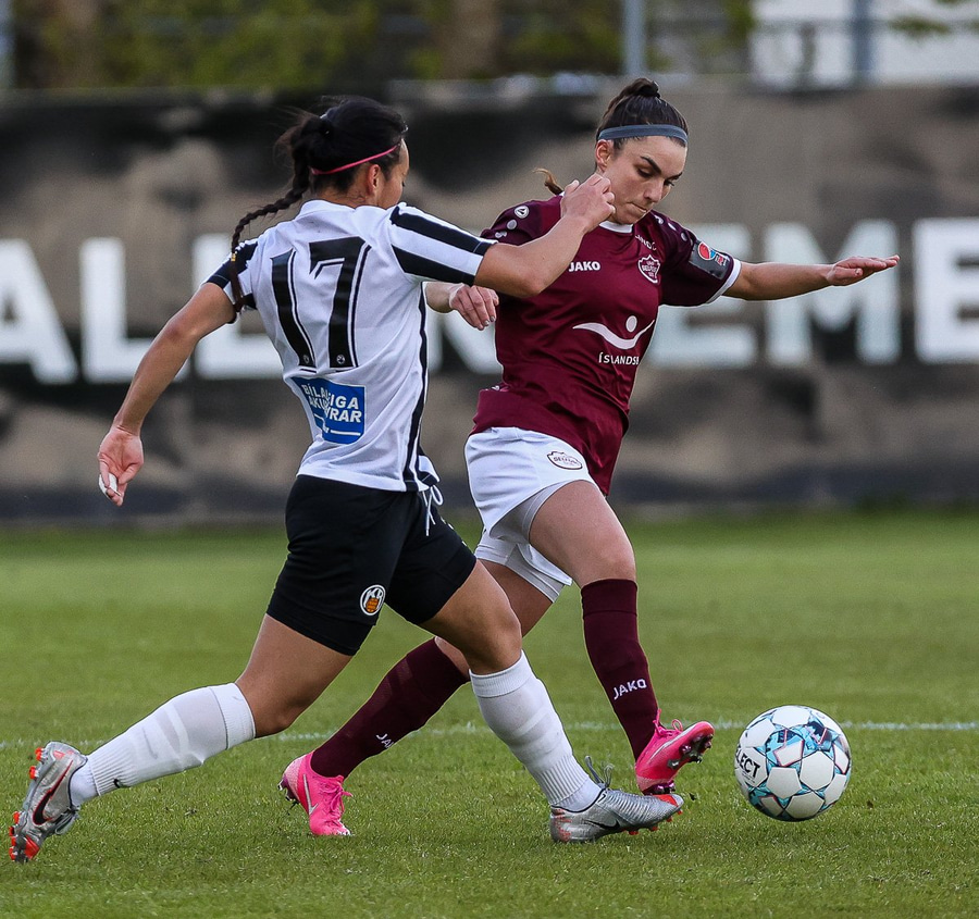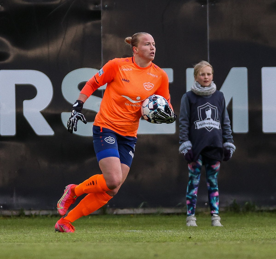 Hörkufæri hjá gestunum þegar Katrín Ágústs kemst ein í gegn en Ingibjörg ver vel