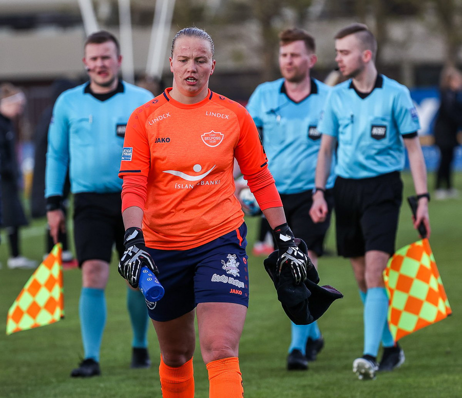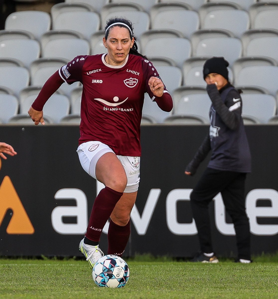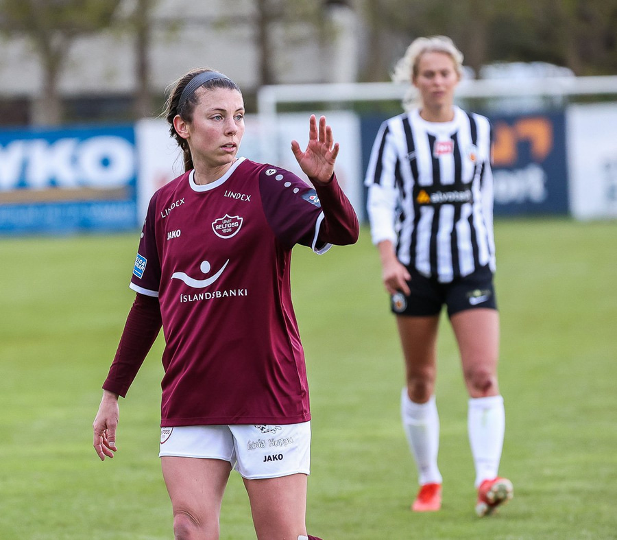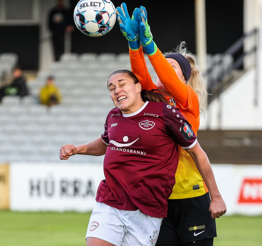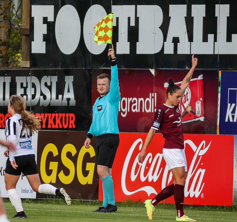 Brenna Lovera skoraði hér mark fyrir Selfoss eftir sendingu frá Barböru frá hægri. Selfoss stelpurnar fagna vel og innilega þangað til aðstoðardómarinn lyftir upp flagginu og rangstaða dæmd.