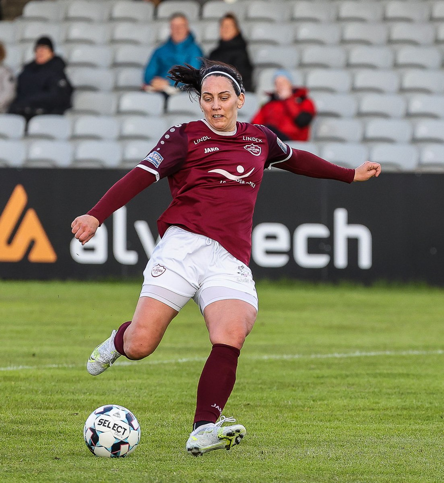 Hún fær boltann á miðjunni, keyrir aðeins fram og skýtur af löngu færi og boltinn fer rétt yfir