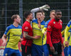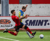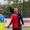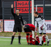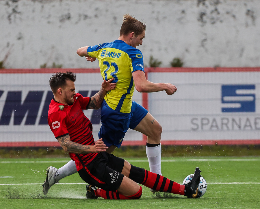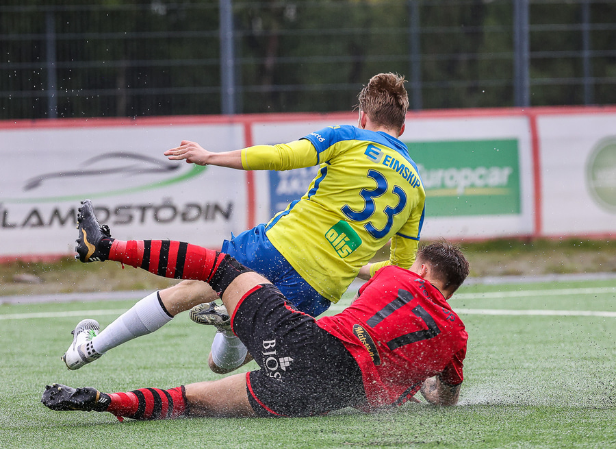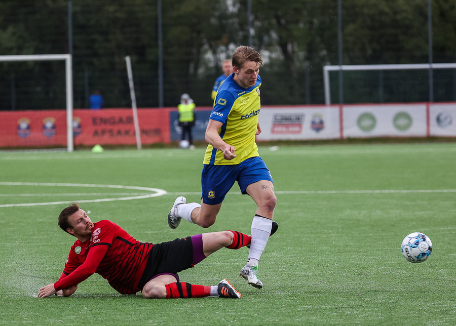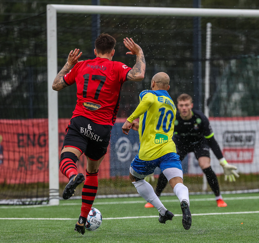 Sigurður Bjartur nálægt því að komast í gegn en dæmt sóknarbrot á hann. Bjössi Hreiðars alls ekki sáttur.
