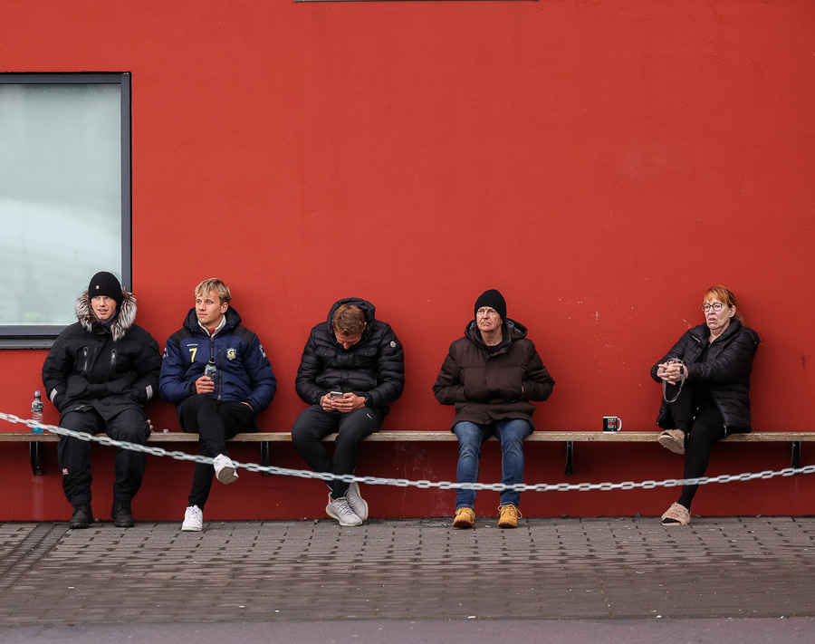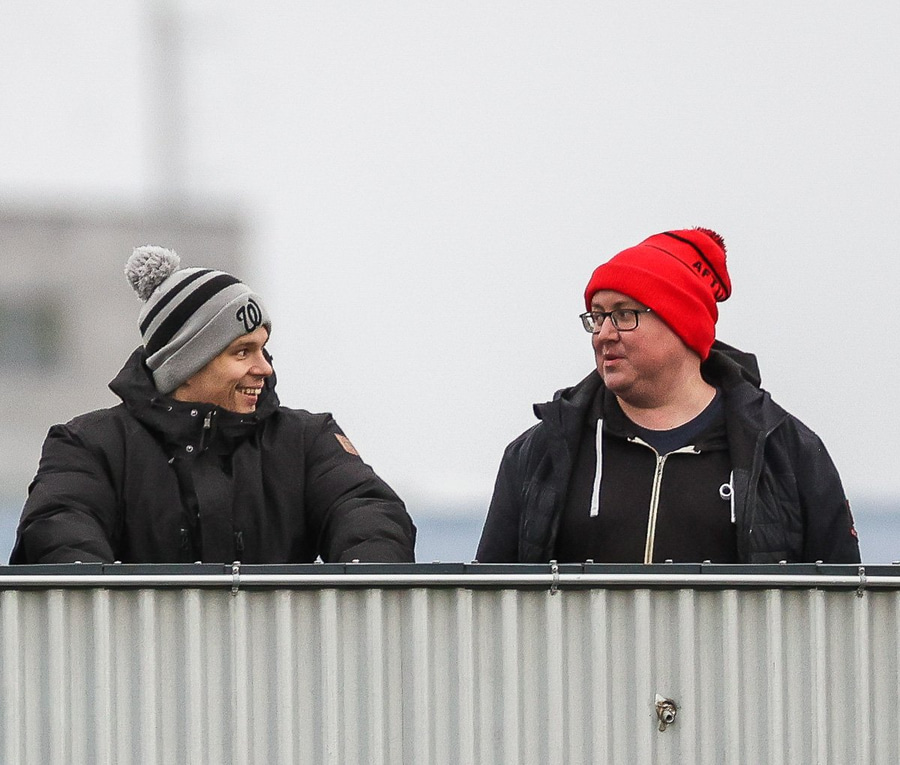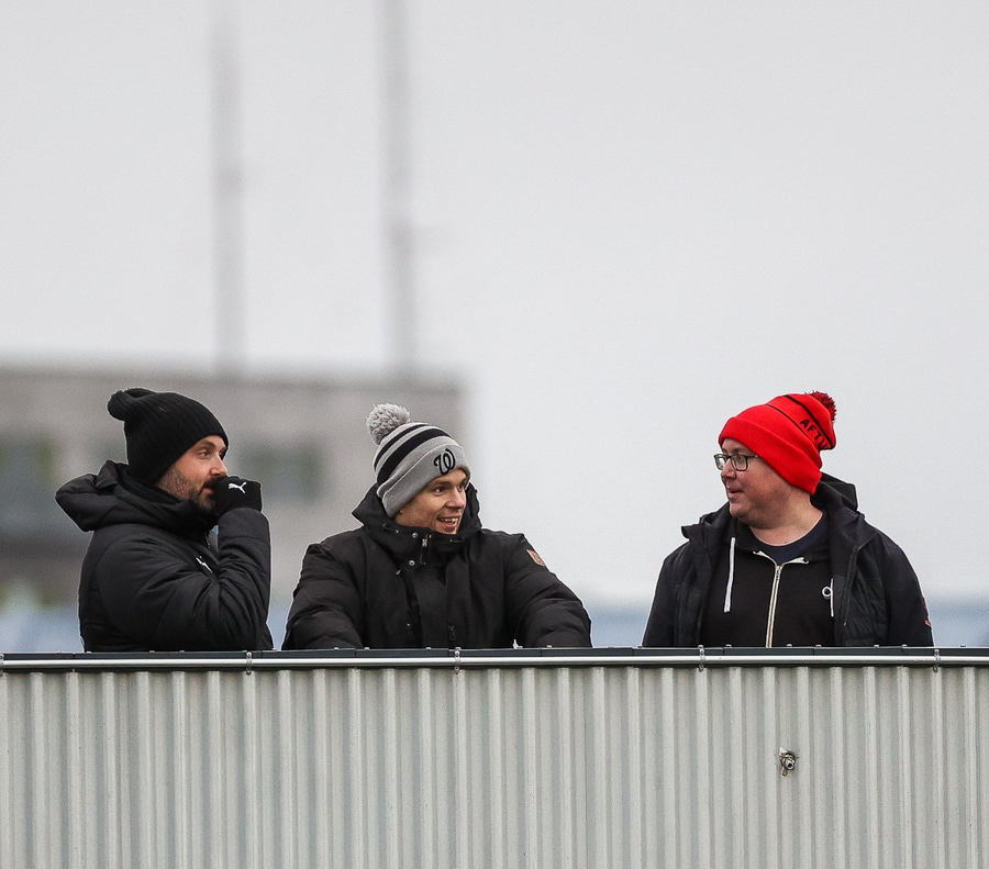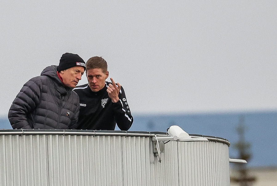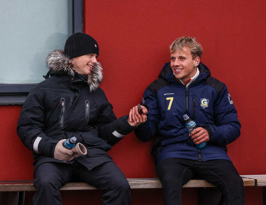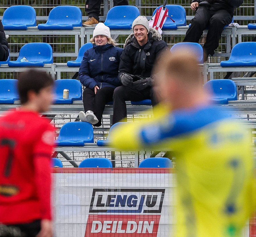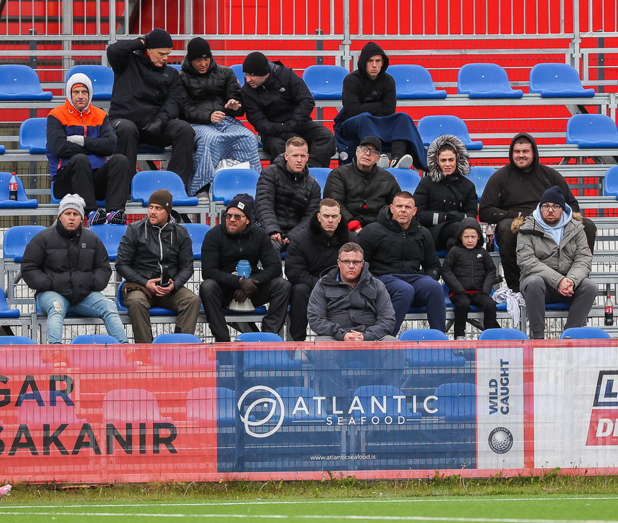 Alvöru flóra áhorfenda hérna. Valtýr Björn og Tómas Þór fóru yfir málin yfir kaffi í hálfleiknum. Davíð Snorri U21 landsliðsþjálfari er hér og einnig Gary Martin.