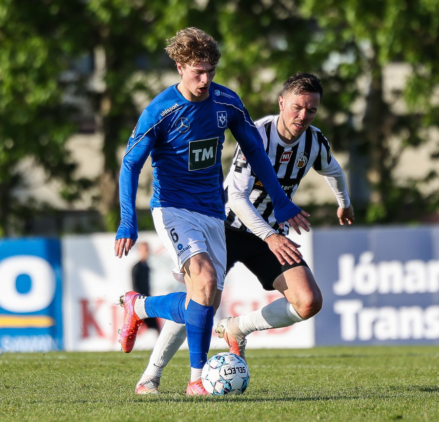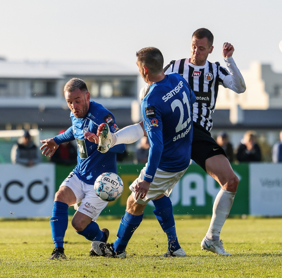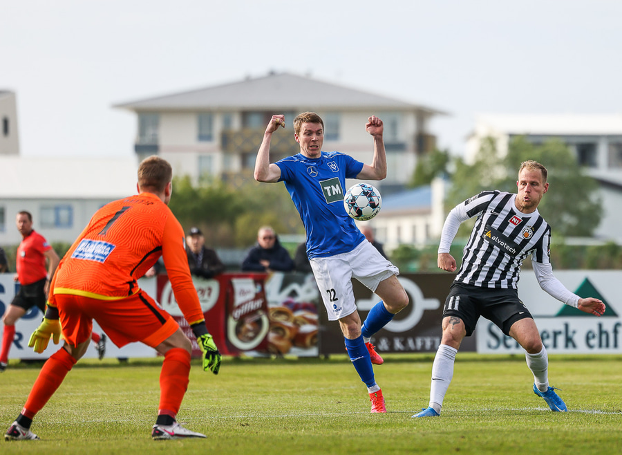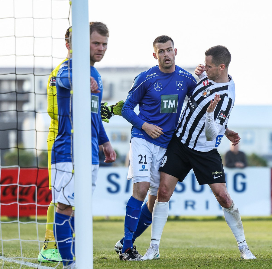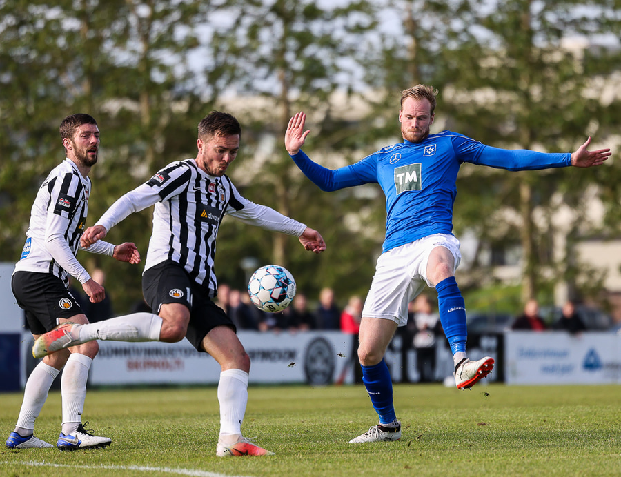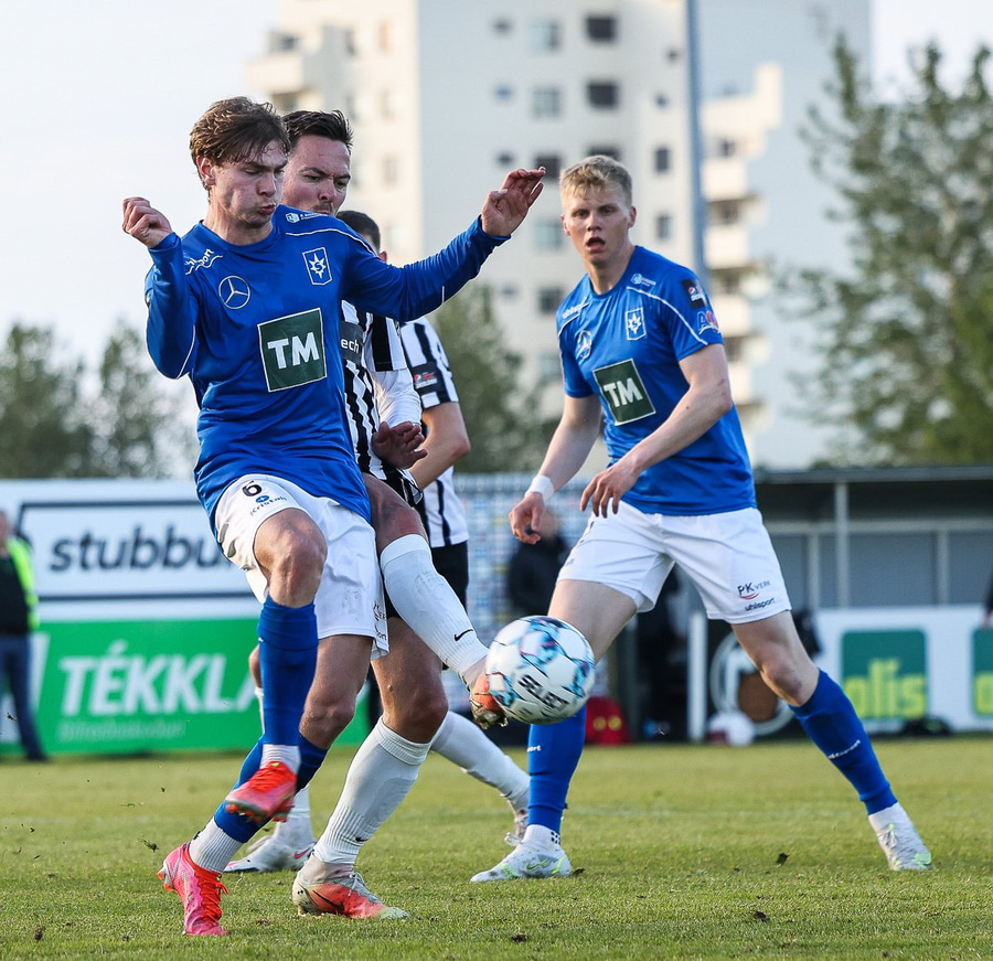 Kennie lætur vaða en Björn rennir sér fyrir og kemst fyrir skotið og Haraldur hirðir svo upp boltann.