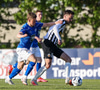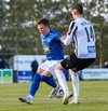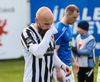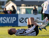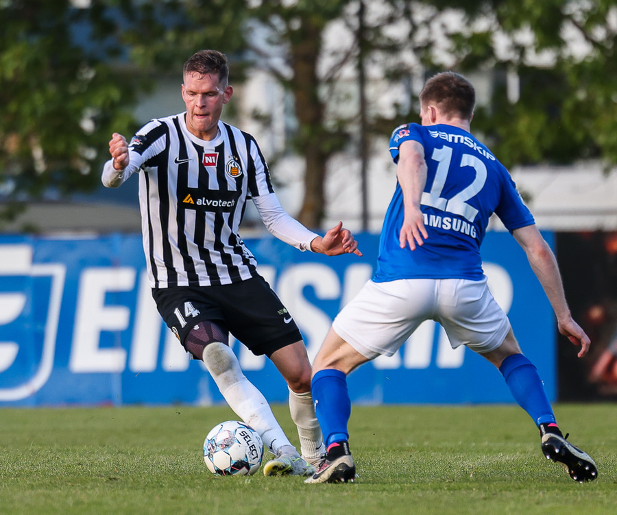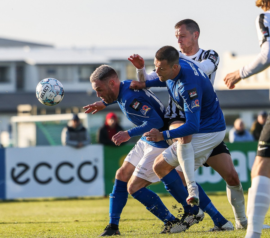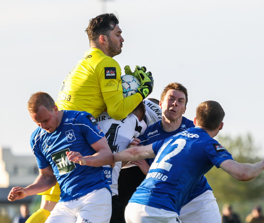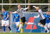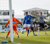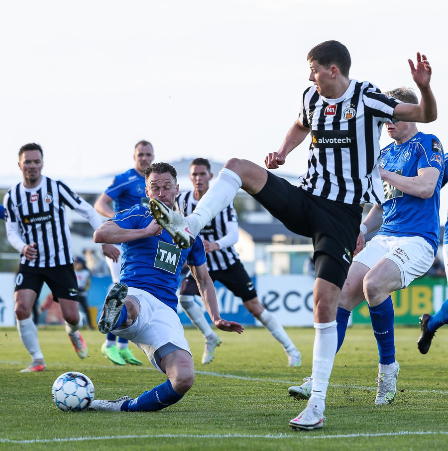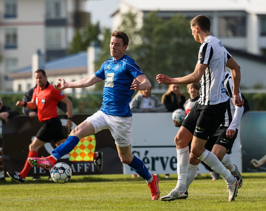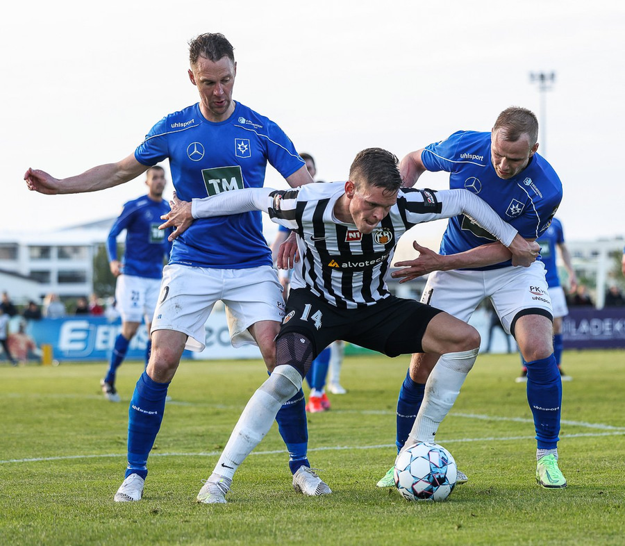 Kennie lætur vaða en Björn rennir sér fyrir og kemst fyrir skotið og Haraldur hirðir svo upp boltann.
