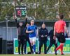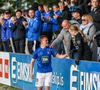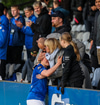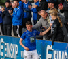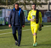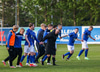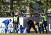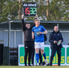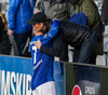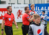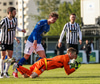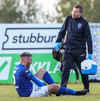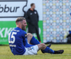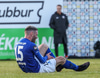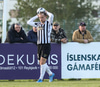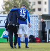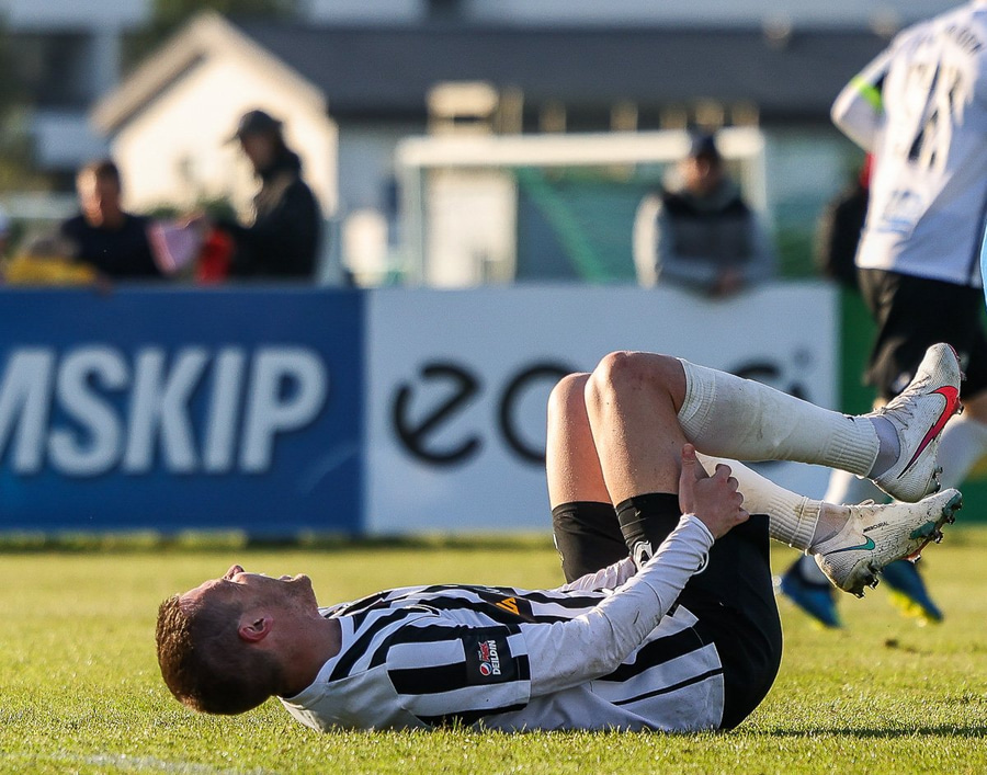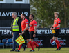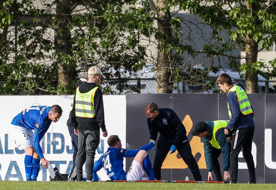 Eyjólfur fer niður í hafsent. Björn Berg getur ekki haldið leik áfram.