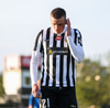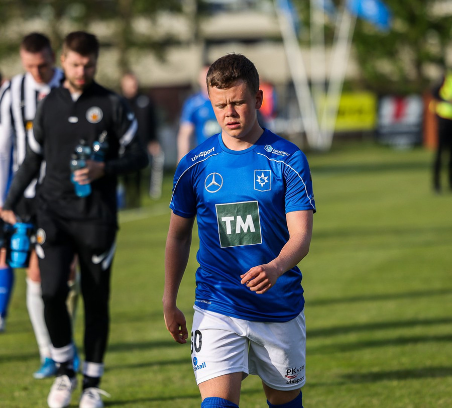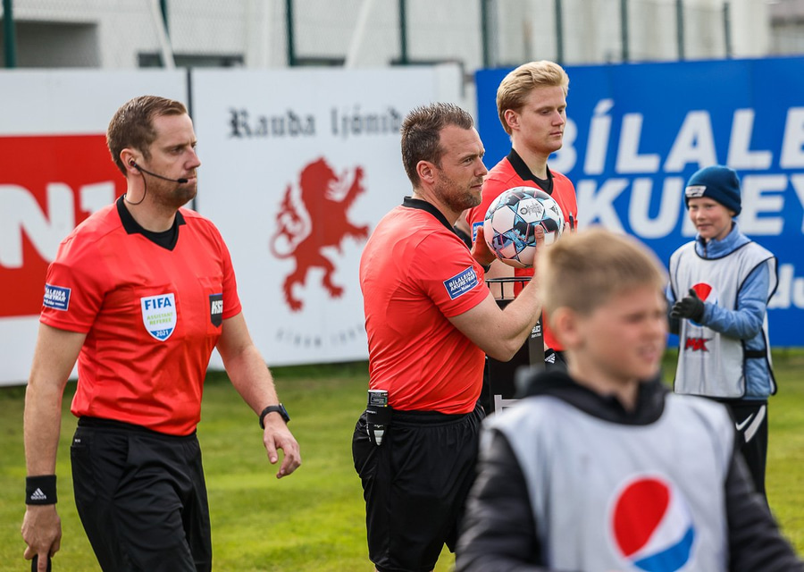 Emil Atlason fer ótrúlega auðveldlega niður og Sigurður Hjörtur segir honum að standa upp.