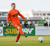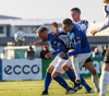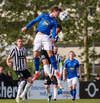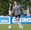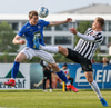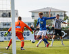 Eyjólfur hreinsar fyrirgjöf Kennie í aðra hornspyrnu.
