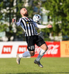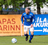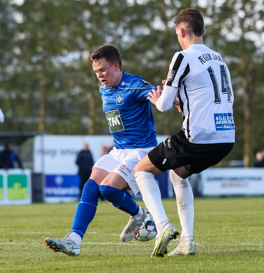 Þórarinn Ingi skallar fyrirgjöf Kristins aftur fyrir.