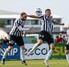 Hilmar Árni með fyrirgjöfina úr horninu á fjær þar sem Elís Rafn er en Elís skallar yfir.