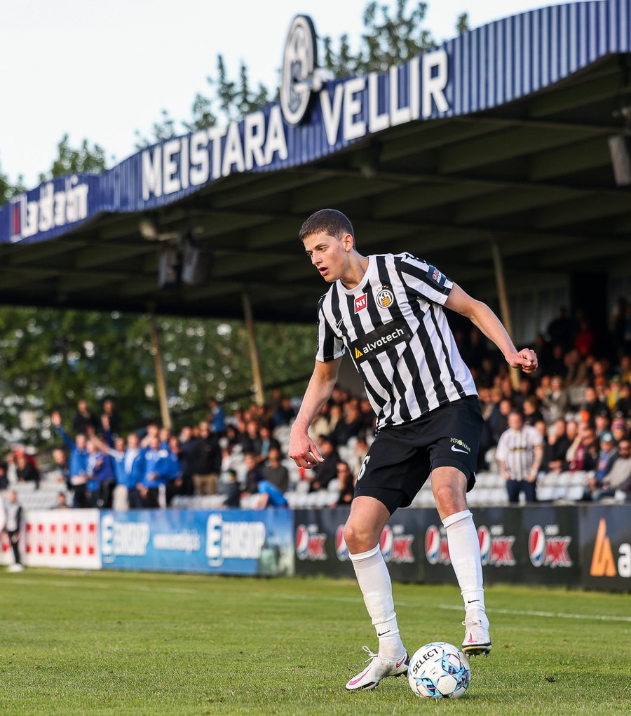 Stefán Árni strax kominn í boltann. Á fína fyrirgjöf inn á Kjartan Henry en Haraldur kemst í þennan bolta.