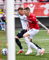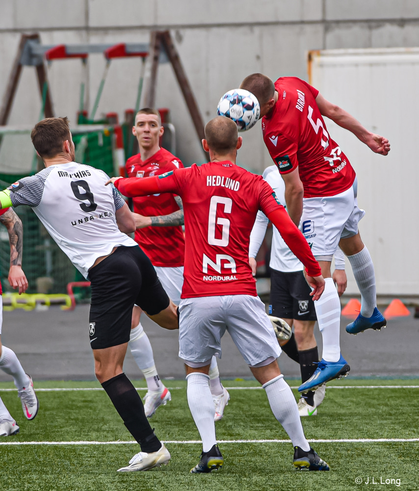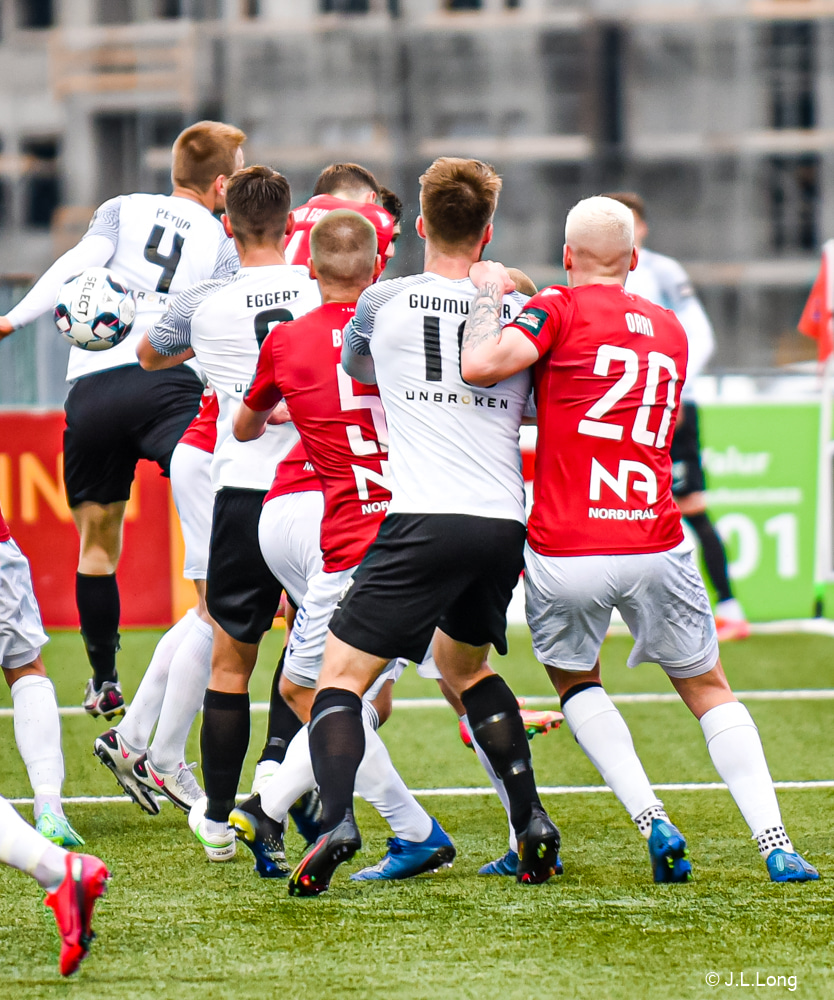 Sigurður Egill með fyrirgjöf sem Gunnar handsamar. Sótt á báða bóga í þessum leik. Hver verður fyrstur til að reka smiðshöggið?
