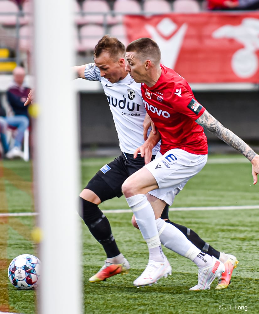 Sverrir Páll Hjaltested sleppur einn í gegn eftir sendingu frá Orra. Engin rangstaða dæmd og Sverrir klárar listilega vel.