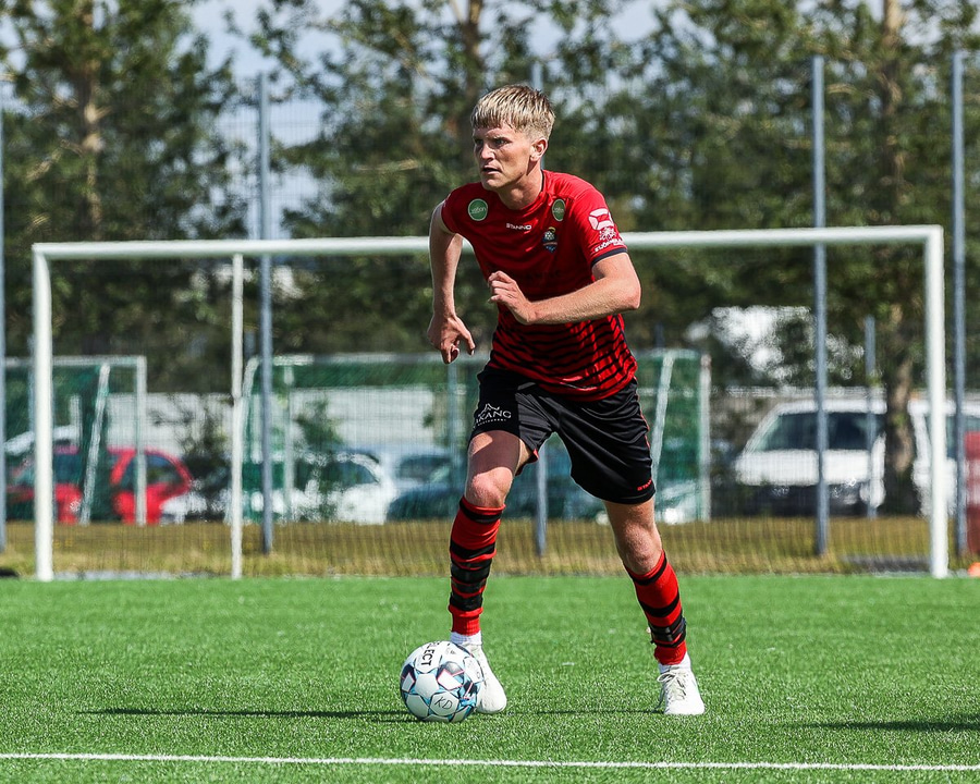 Viktor Júlíusson leikur sér með boltann og kemur sér í fína stöðu við endalínuna, á fyrirgjöf meðfram gervigrasinu sem Sindri Snær missir af. Boltinn í gegnum pakkann og þar er Fall á fjærstönginni sem á skot í hliðarnetið.