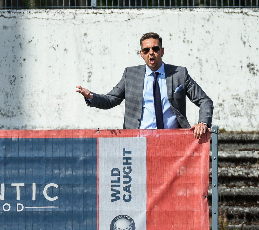 Andri Steinn lætur heyra í sér af hliðarlínunni og vill meina að Norest hafi lagt boltann fyrir sig með hendinni.