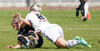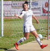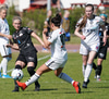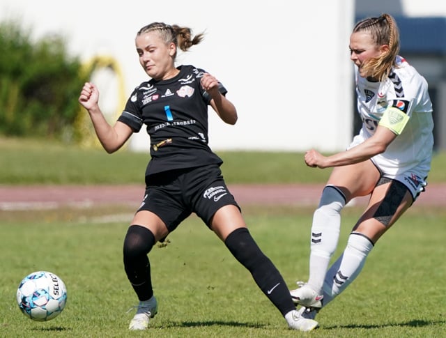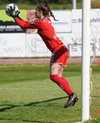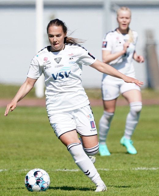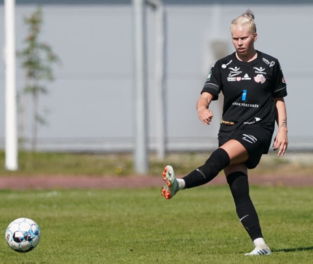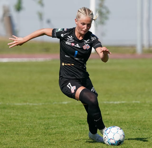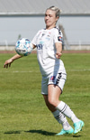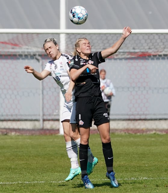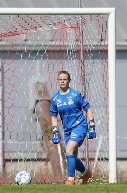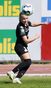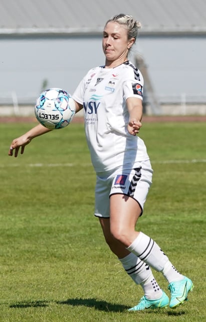 Boltinn dettur fyrir Olgu, hún þarf að teygja sig í boltann og skóflar honum vel yfir.