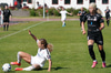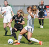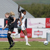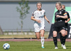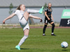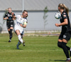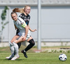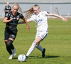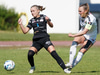 Fyrirgjöf sem er skallað frá, Snædís Ósk lúrir fyrir utan teiginn og á skot sem fer framhjá markinu.