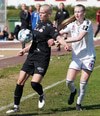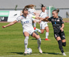 Olga í þröngu færi fyrir ÍBV. með skot/sendingu þvert yfir markið, engin nær til boltanns og hann fer útfyrir endalínu.
