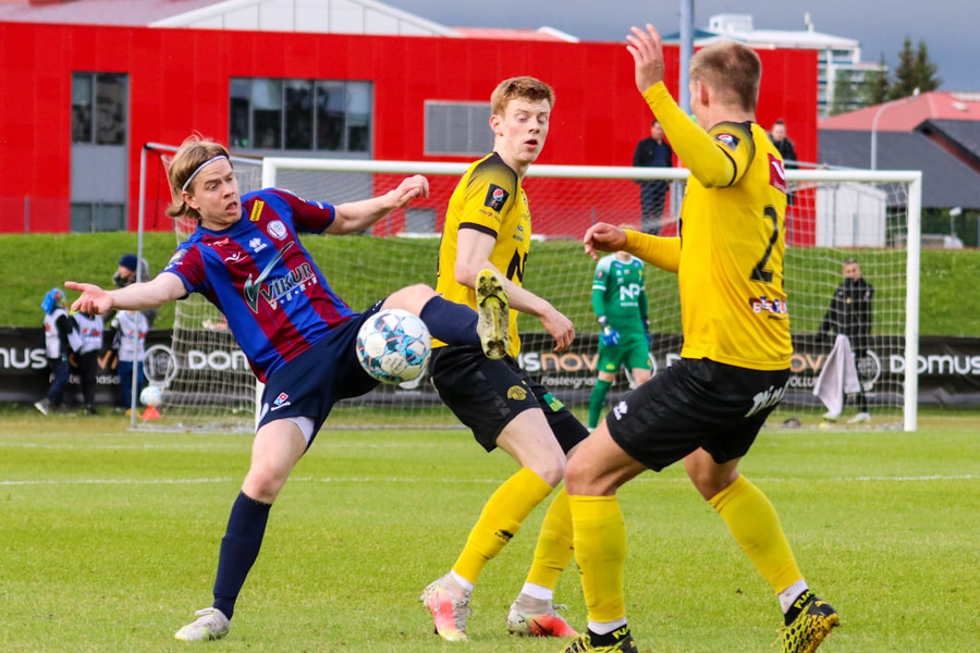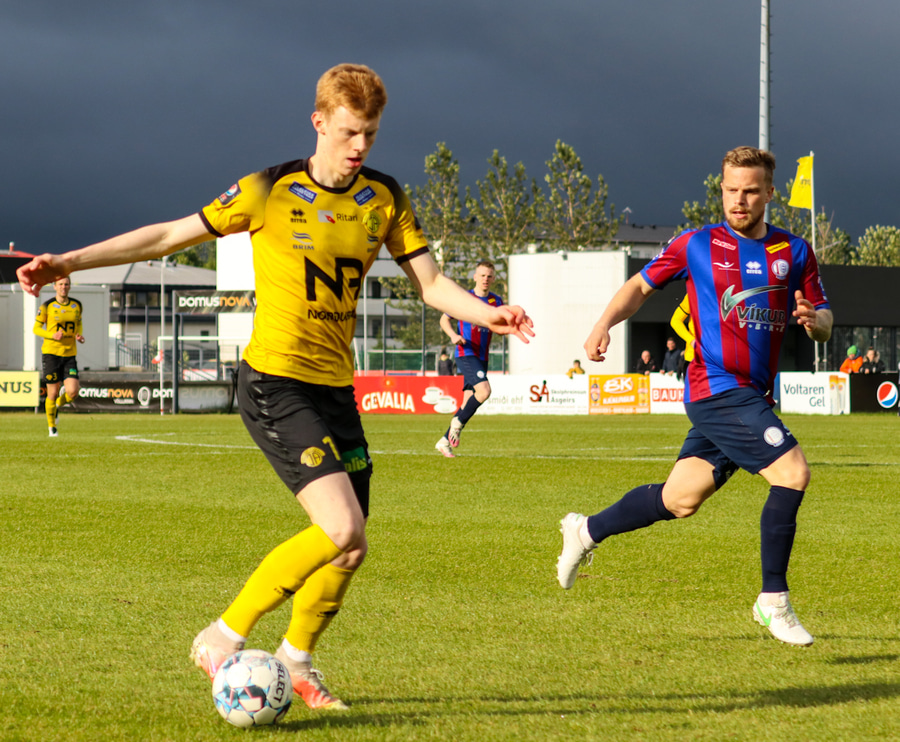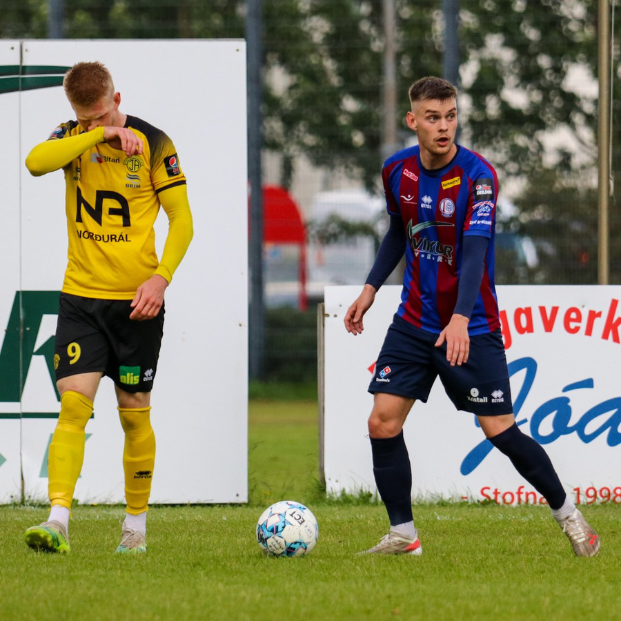 Sævar Atli gerir frábærlega eftir horn Skagans. Fær boltann og er á leiðinni í átt að marki en Viktor Jóns gerir one for the team og klippir hann niður.