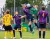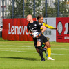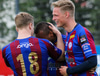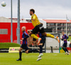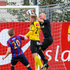 Gísli Laxdal tekur hornspyrnuna beint á kollinn á Morten en skalli hans yfir markið!