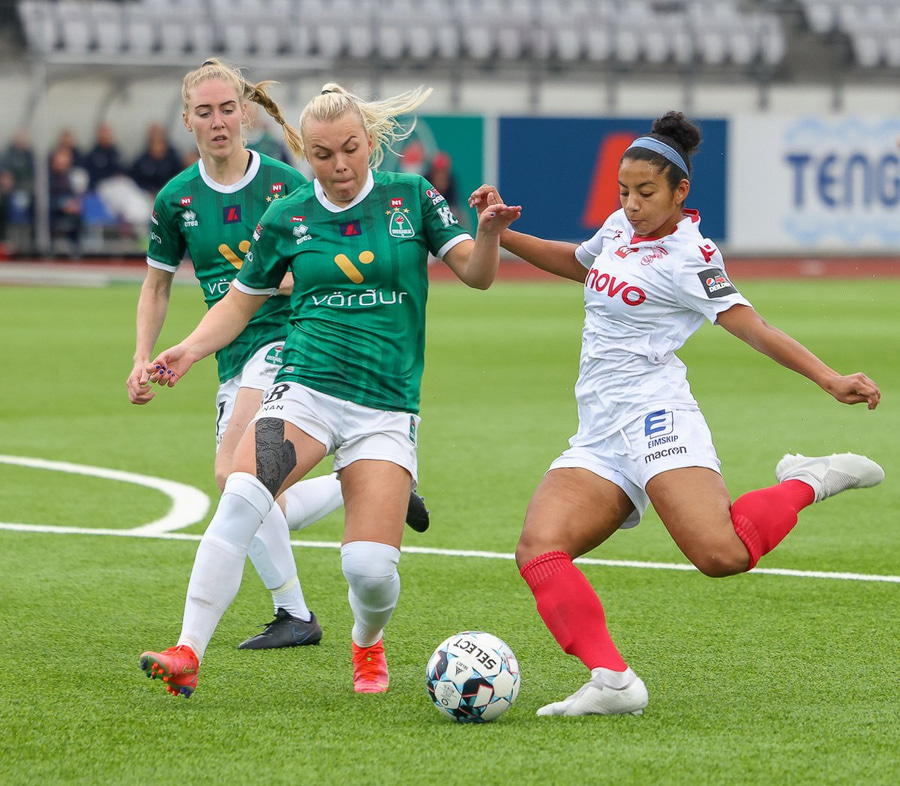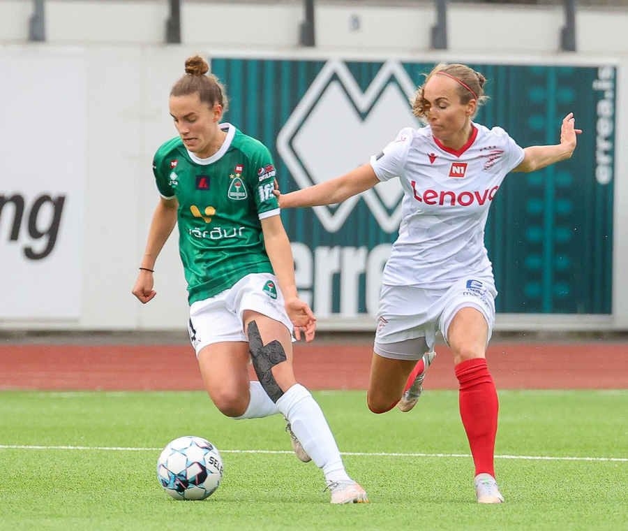 Leikurinn er stopp eins og er á meðan Telma liggur niðri eftir samstuð. Vonandi er í lagi með hana.