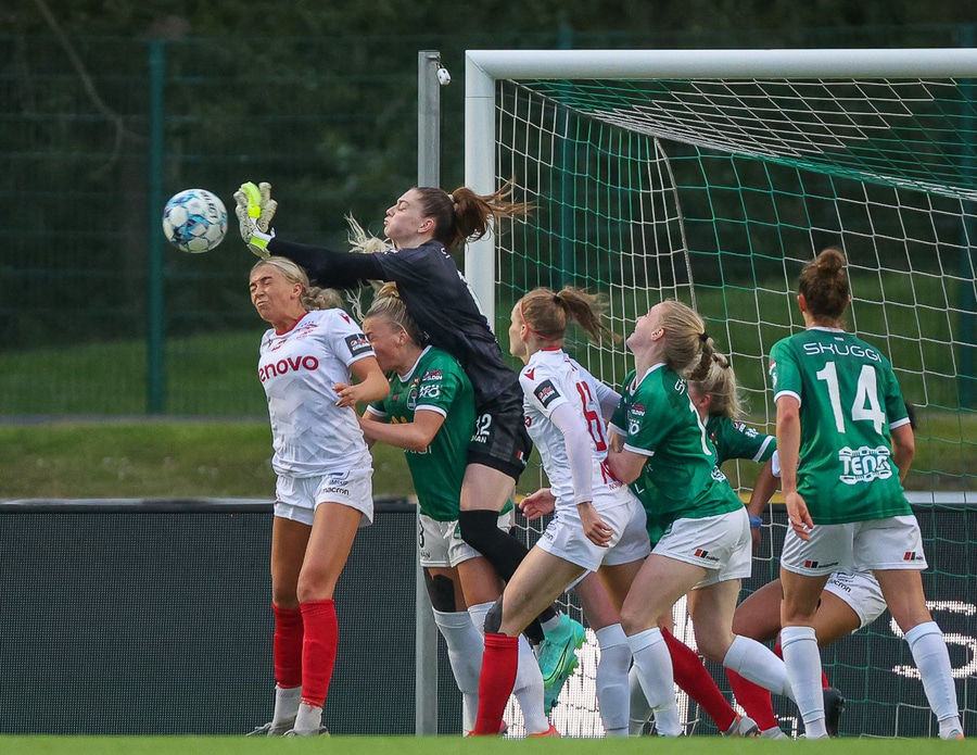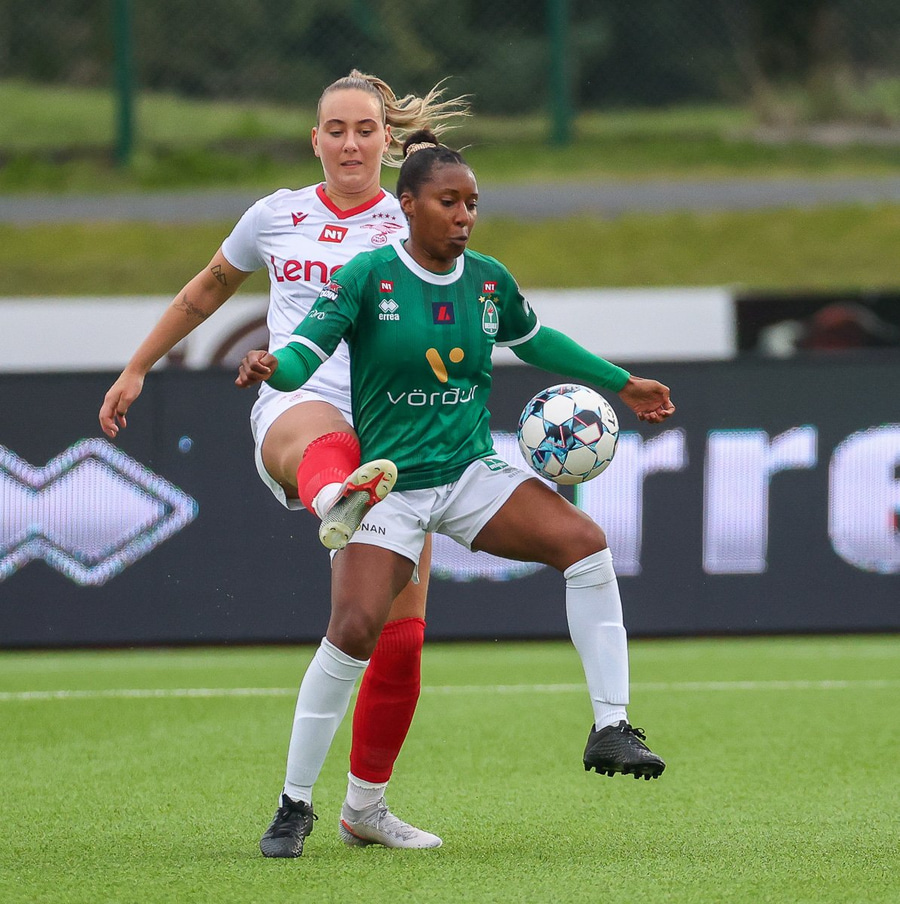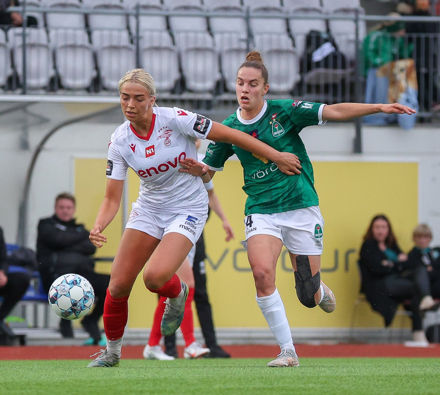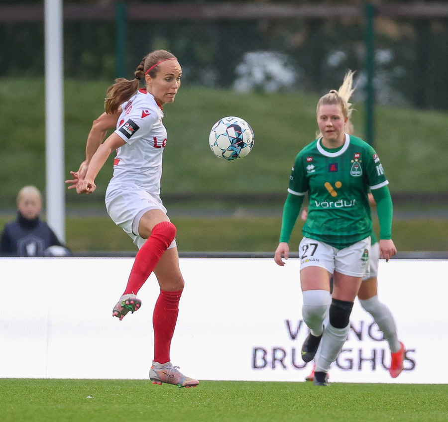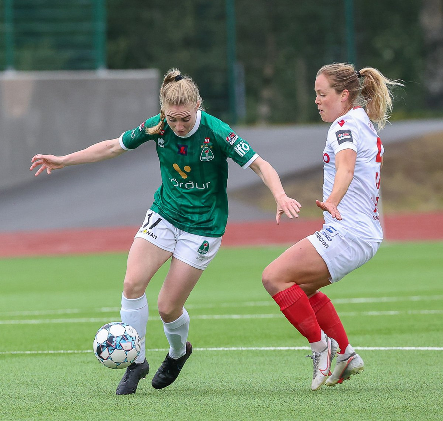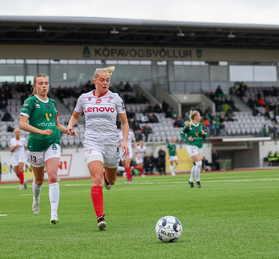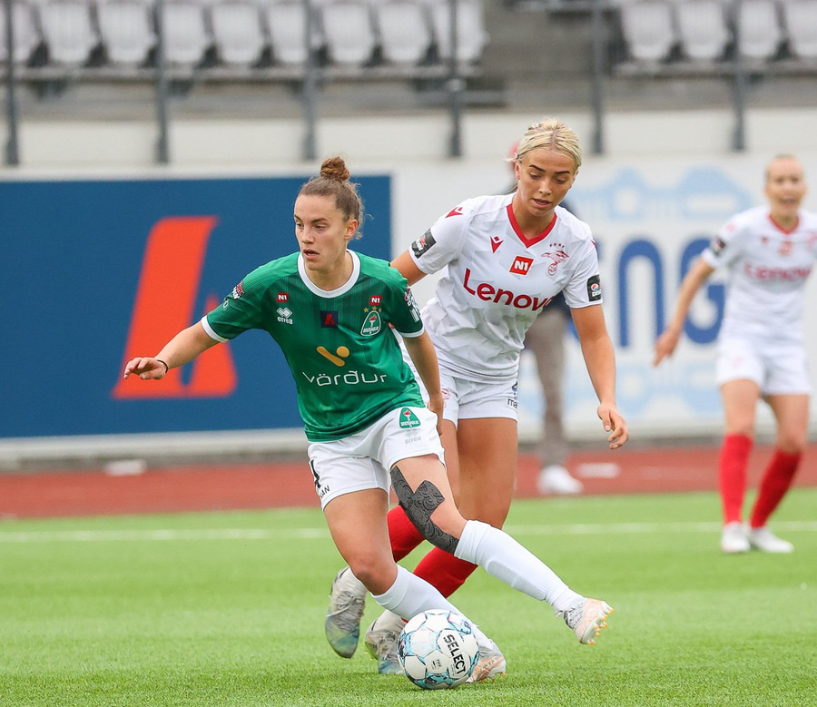 Dauðafæri hjá Völsurum. Mary Alice reynir hér sendingu/skot fyrir sem fer rétt framhjá. Ef einhver hefði staðið á fjær hefði verið auðvelt að pota boltanum inn