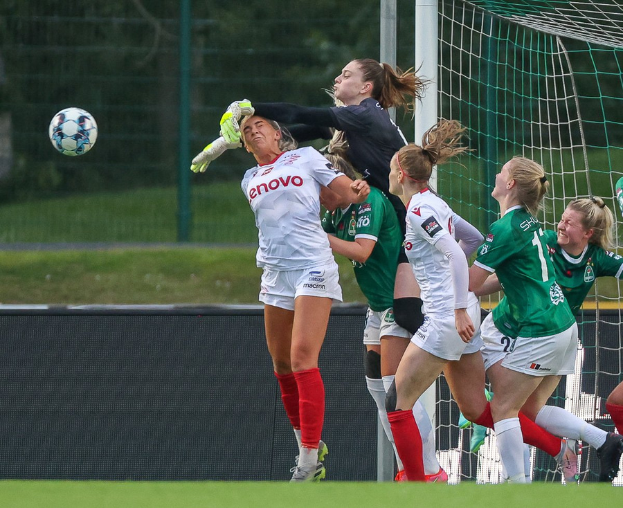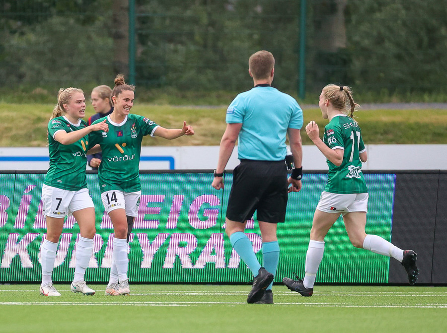 Mary Alice fær sendingu upp vinstri kantinn og Telma kemur út í boltann, Telma sparkar í Mary Alice sem fær boltann aftur og klárar auðveldlega í autt markið
