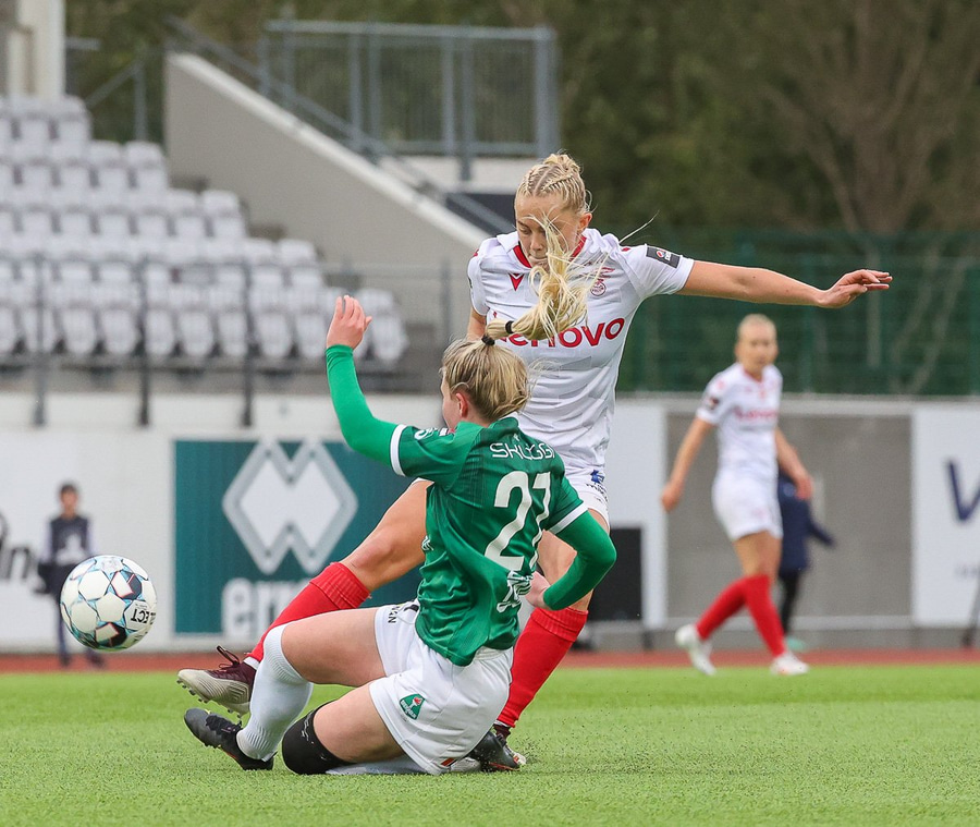 Blikar hreinsa en boltinn berst á Sólveigu Larsen sem reynir skot en það fer yfir markið