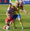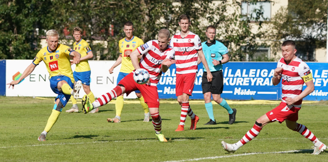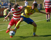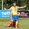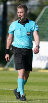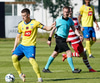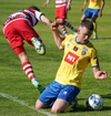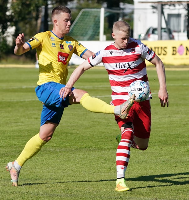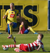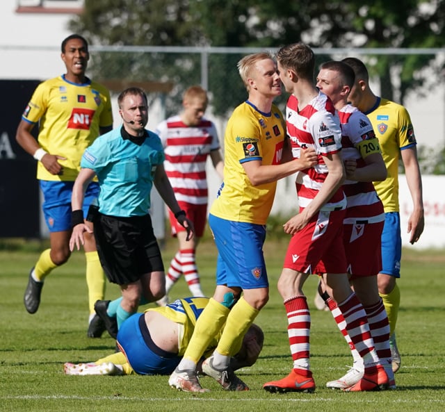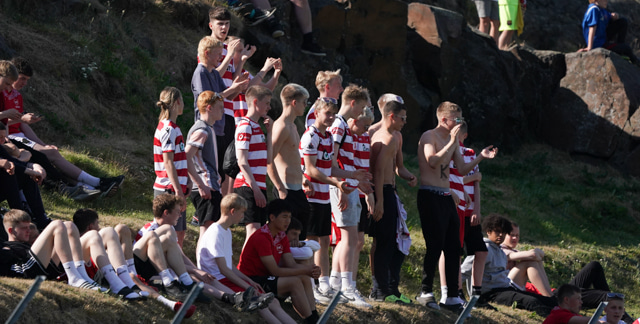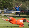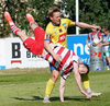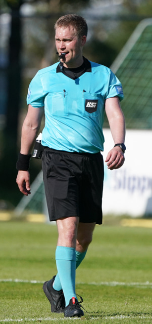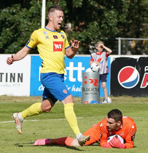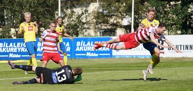 Valgeir Valgeirsson liggur eftir samskipti við Steinþór. Steinþór hafði komið langt útúr markinu til að hreinsa boltann, náði að renna sér og tækla boltann útaf rétt áður en Valgeir náði valdi á boltanum.