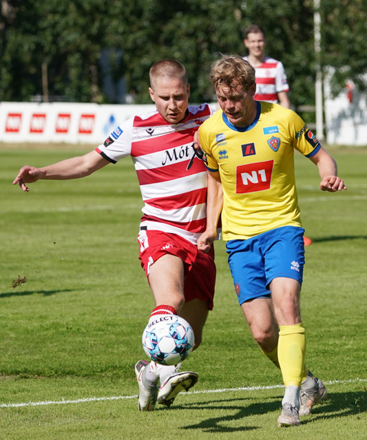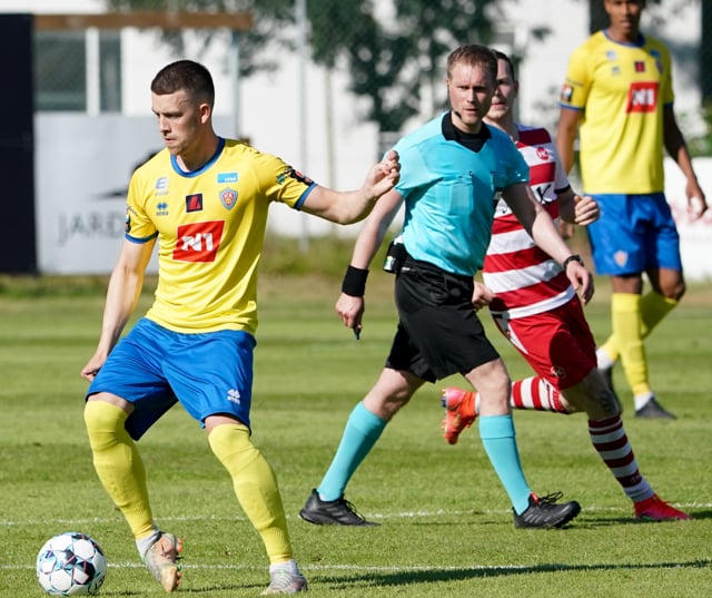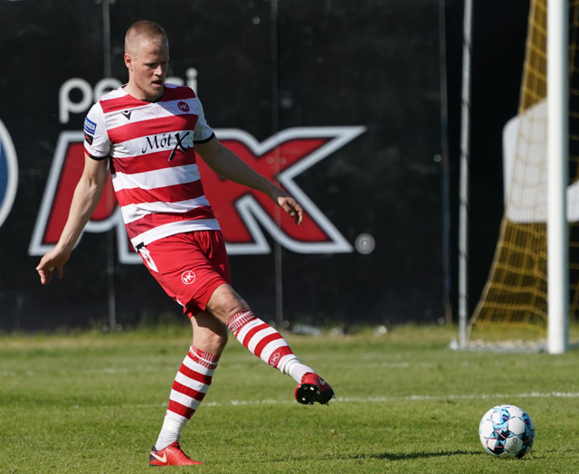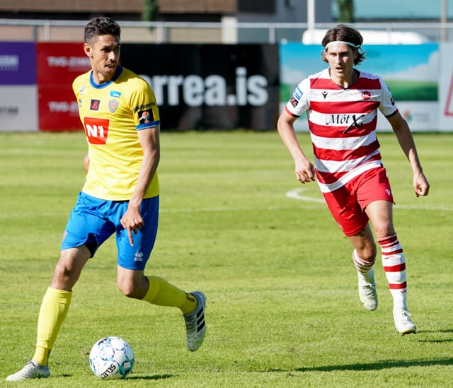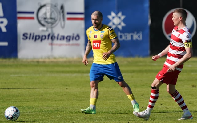 Atli Arnarson vinnur hornspyrnu af miklu harðfylgi eftir langa baráttu úti við hornfána við Mikkel Qvist. Ásgeir Marteinsson fær aðra hornspyrnu í kjölfarið.