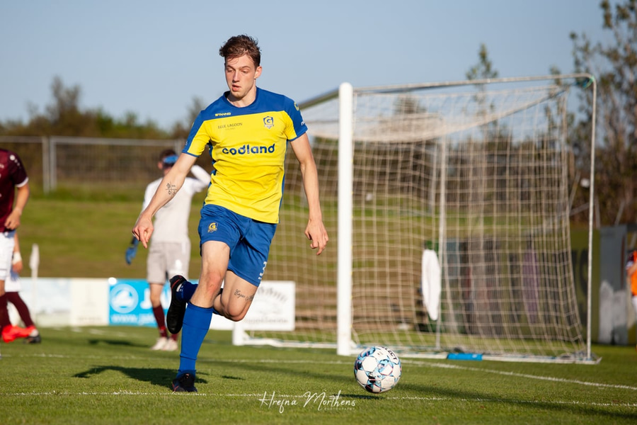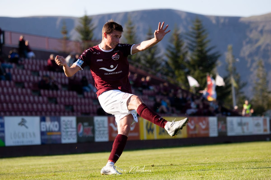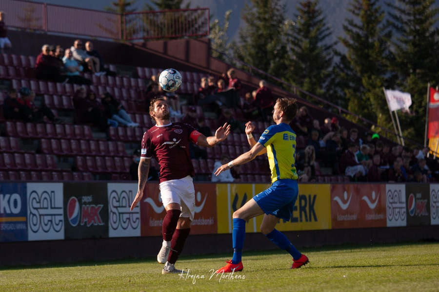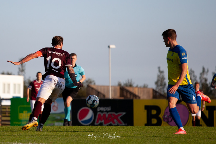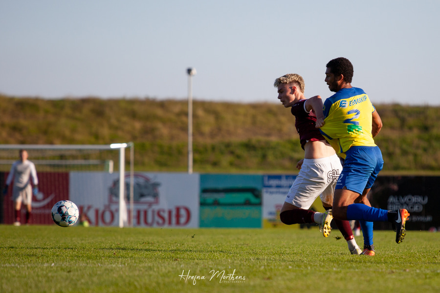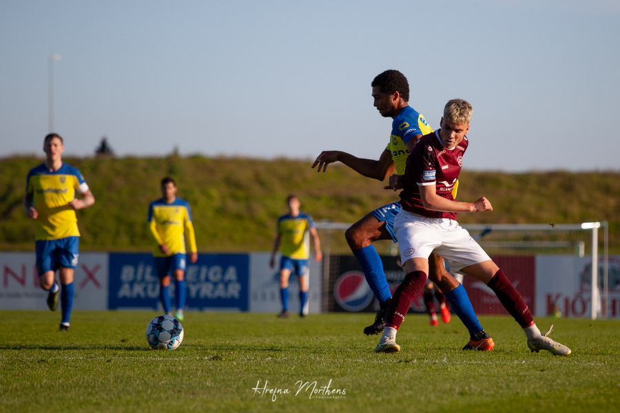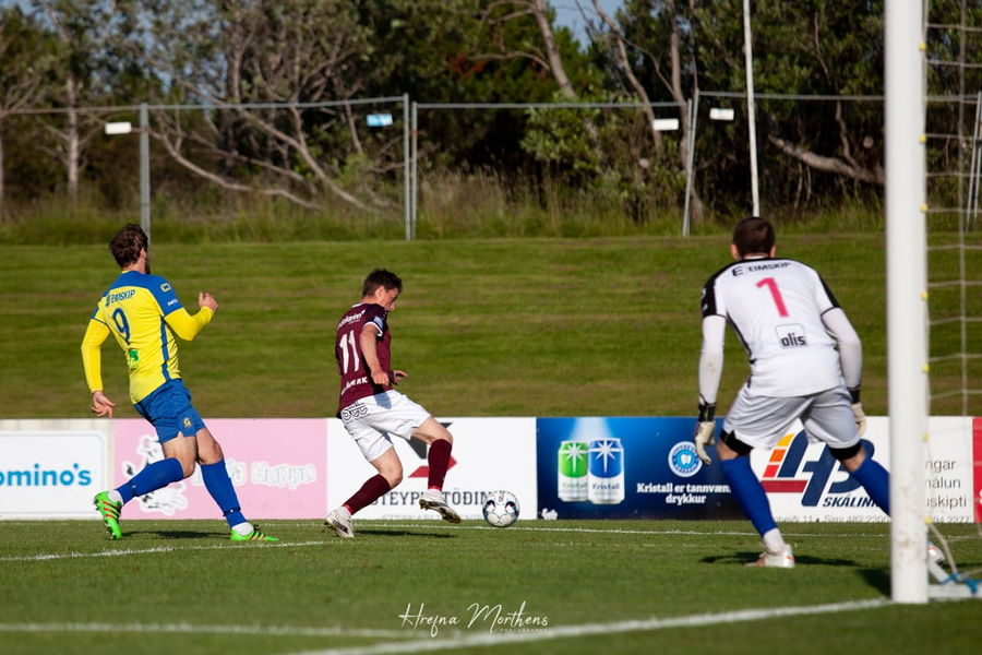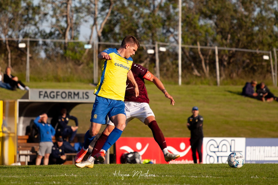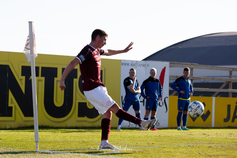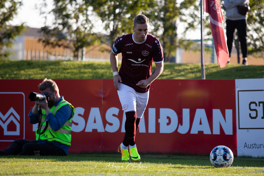 Þorsteinn með góðan bolta sem endar hjá Breka sem setur boltan í varnarnmann sem setur hann í horn og ekkert verður úr horninu.