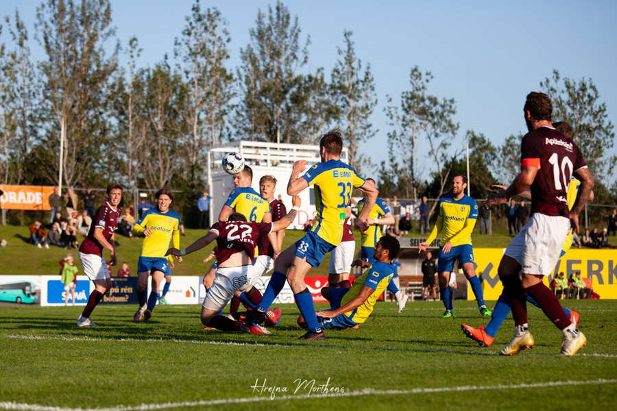 Þorsteinn tekur fyrsta horn Selfoss sem er stutt einn tveir en Grindavík skallar í burtu.