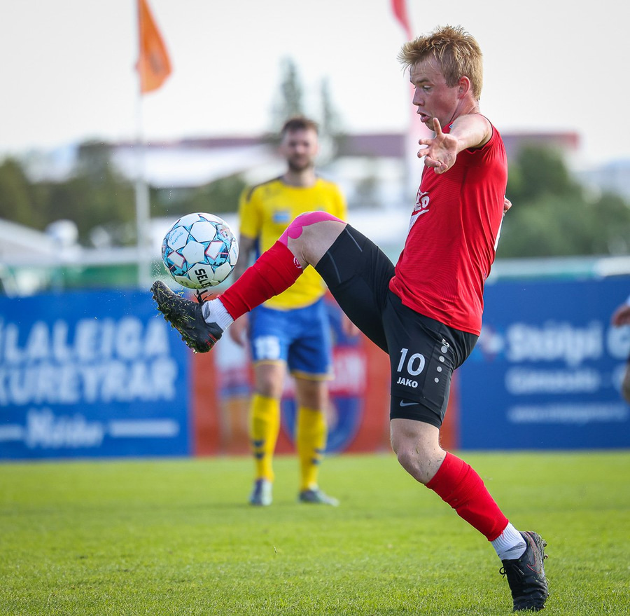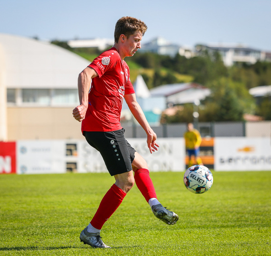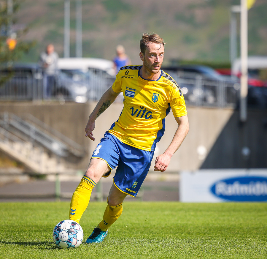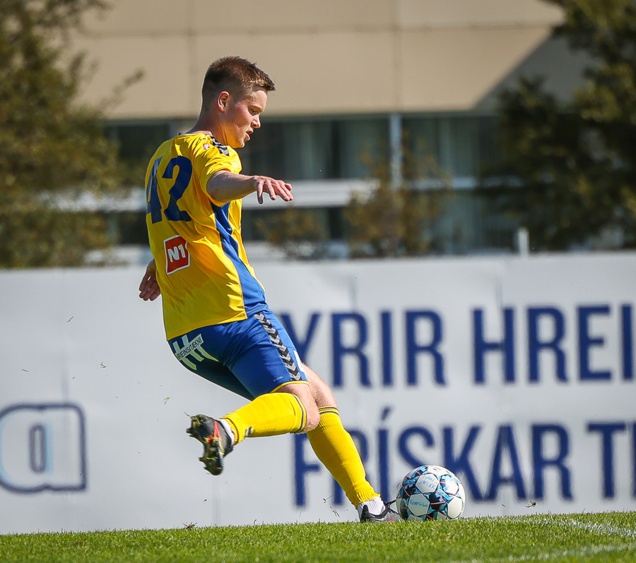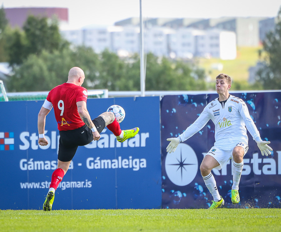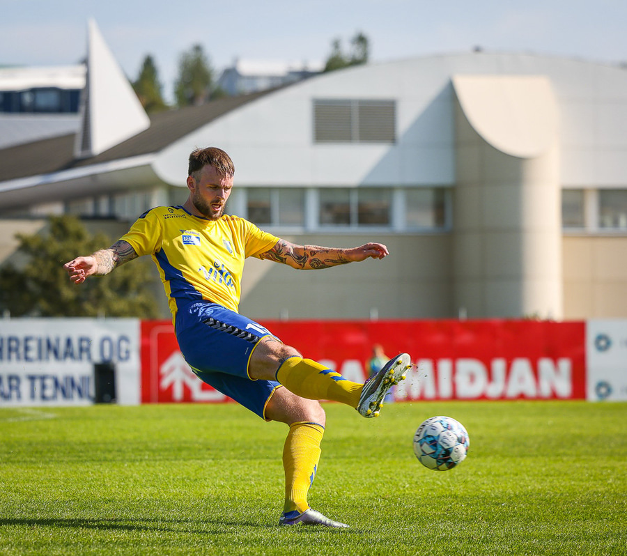 Pedro Vazquez með snögga aukaspyrnu sem Arnór Gauti nær að reka tærnar í á undan Sigurjóni. Boltinn yfir markið en besti séns gestanna til þessa.