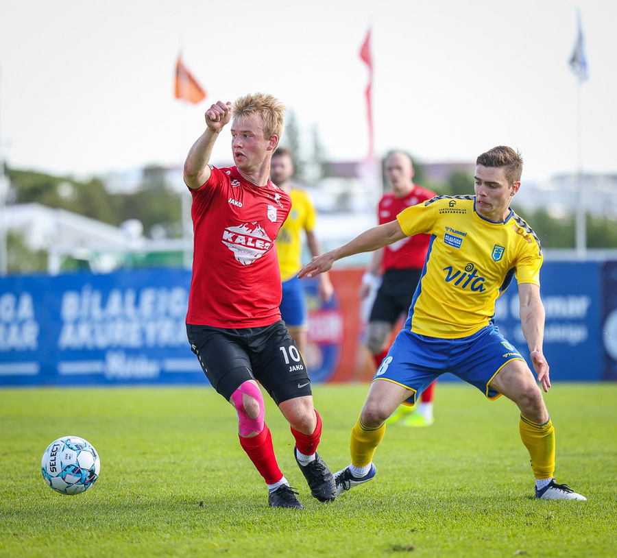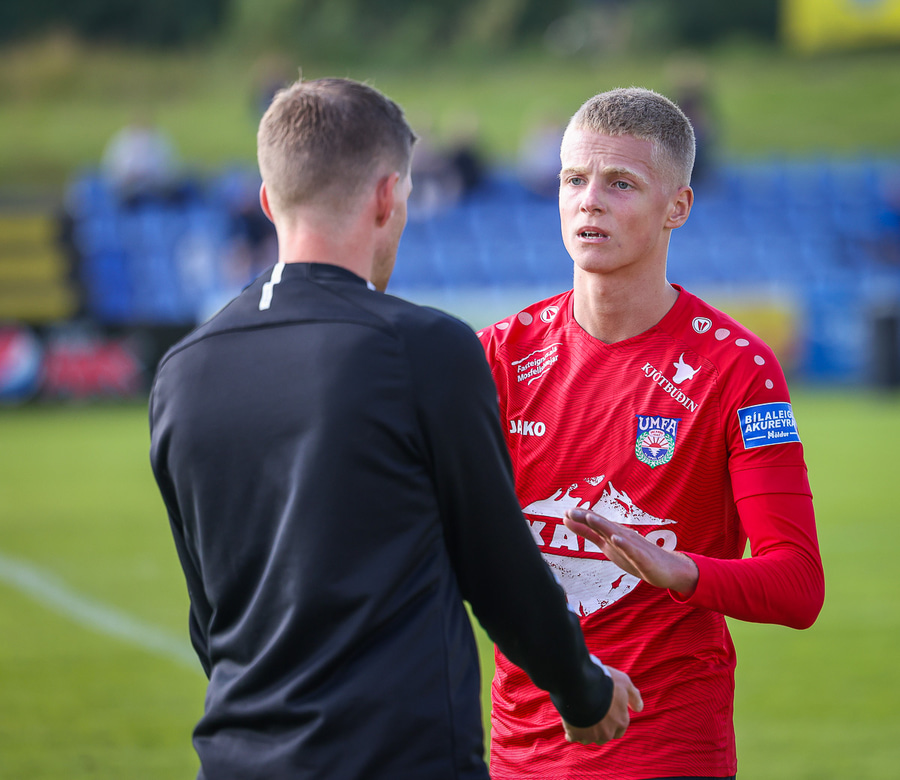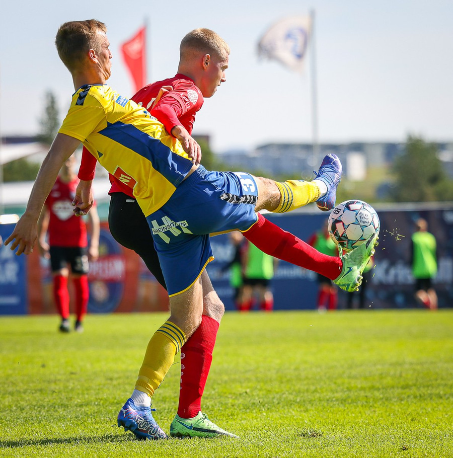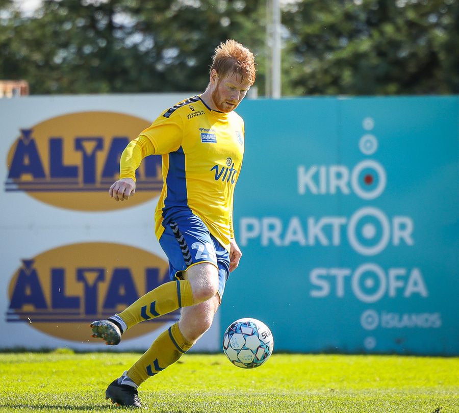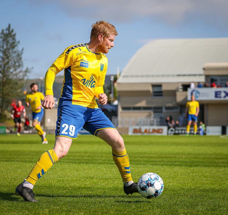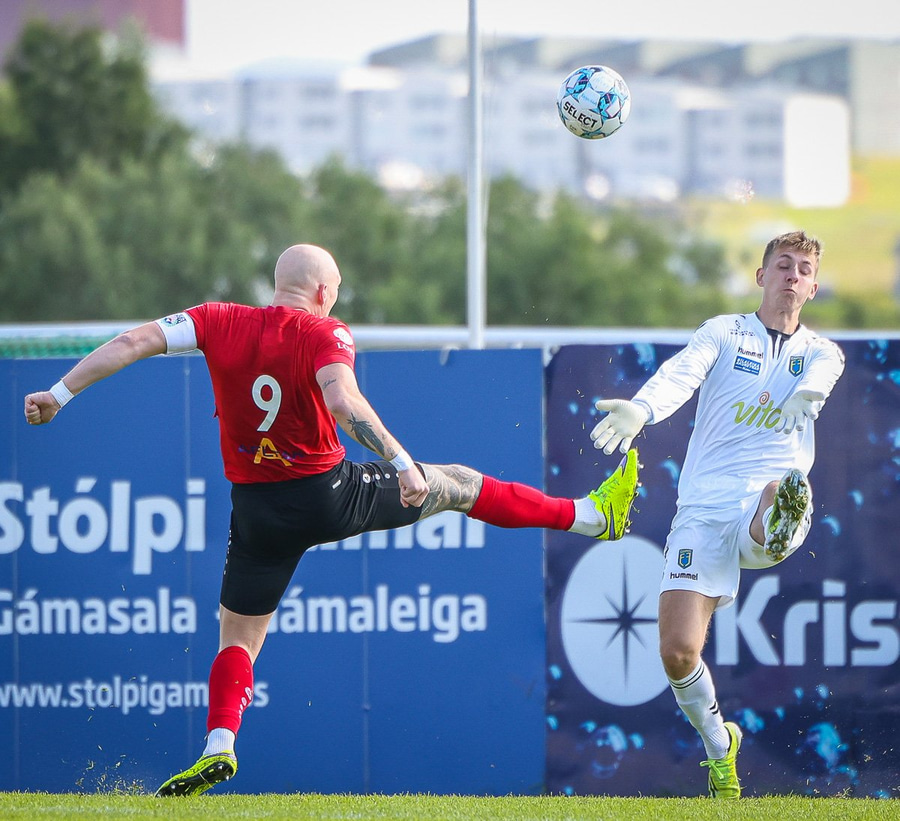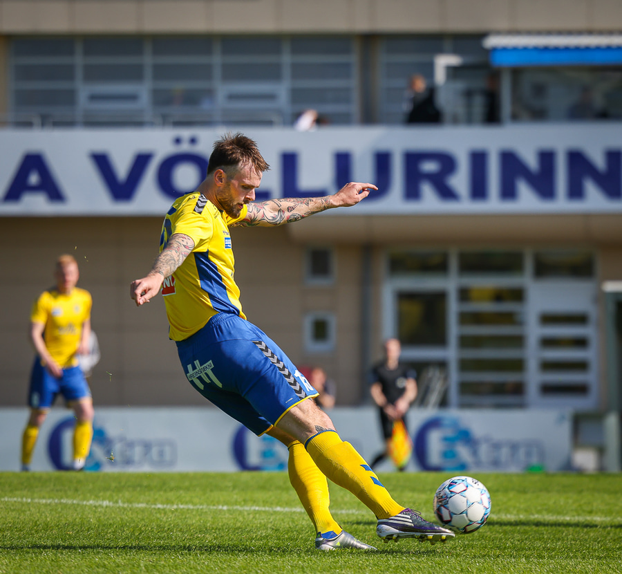 Pedro Vazquez með snögga aukaspyrnu sem Arnór Gauti nær að reka tærnar í á undan Sigurjóni. Boltinn yfir markið en besti séns gestanna til þessa.