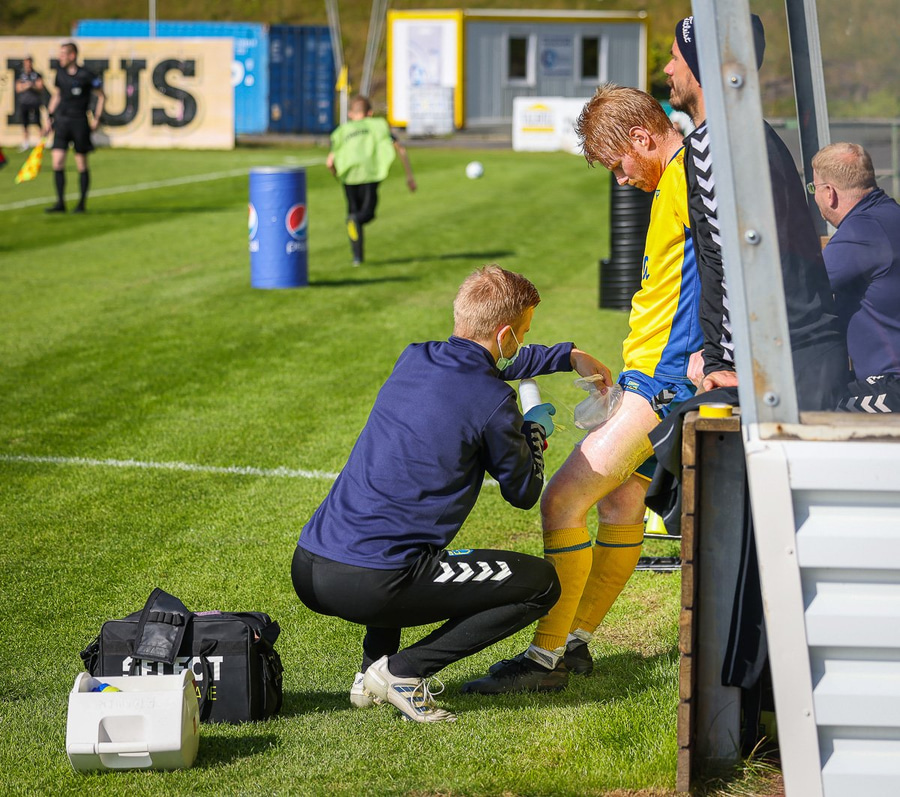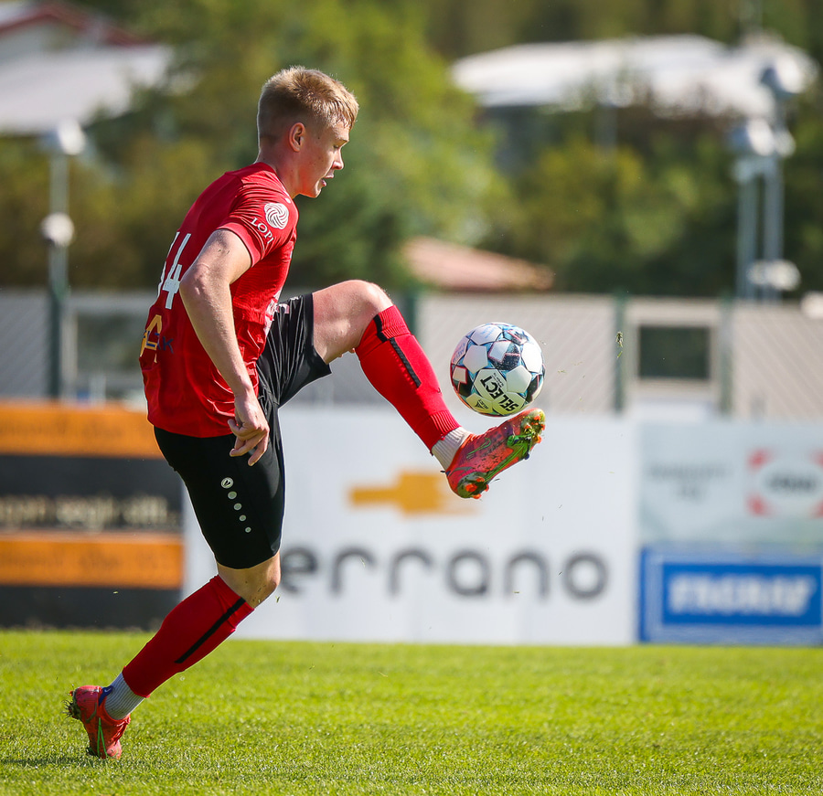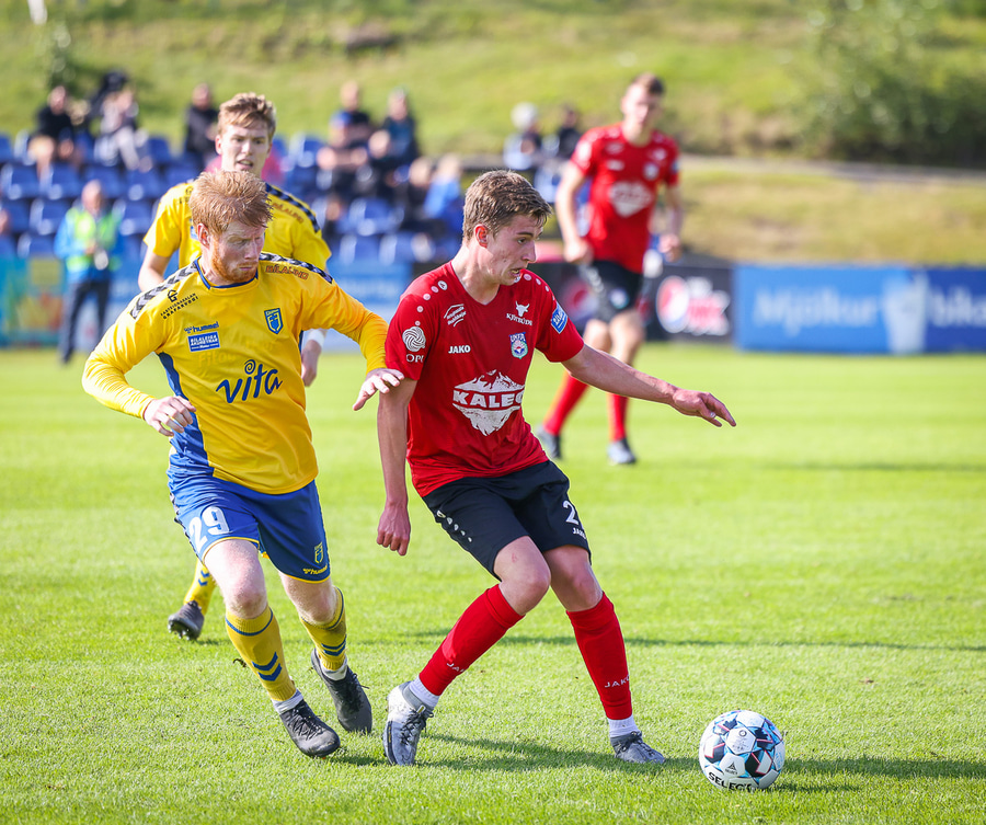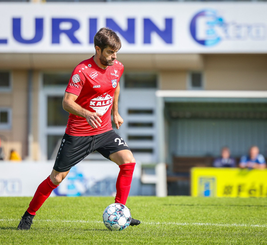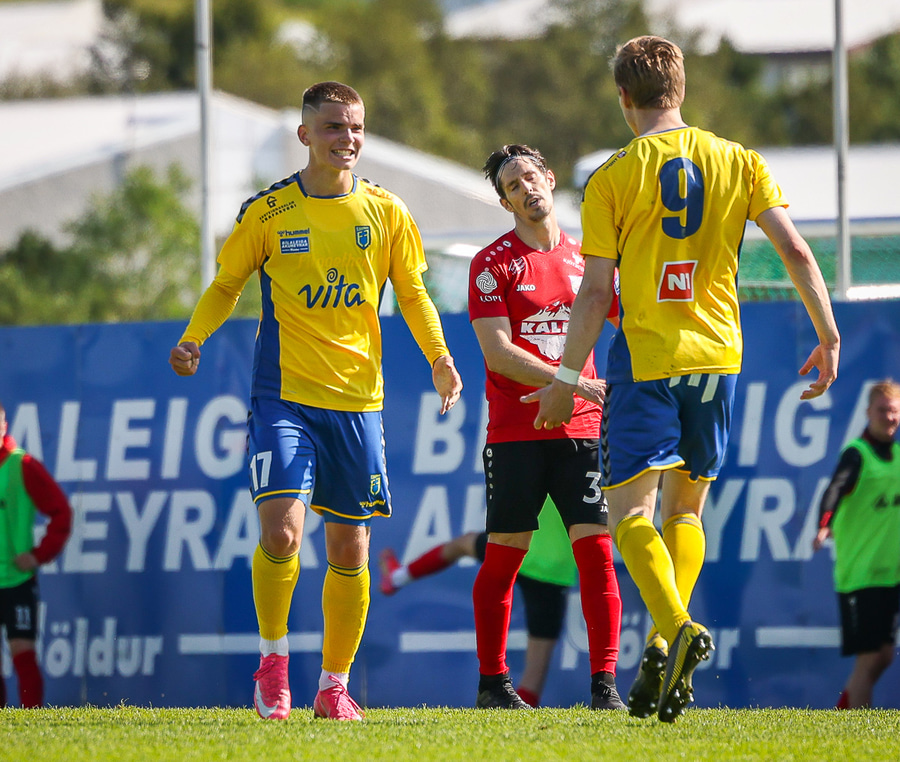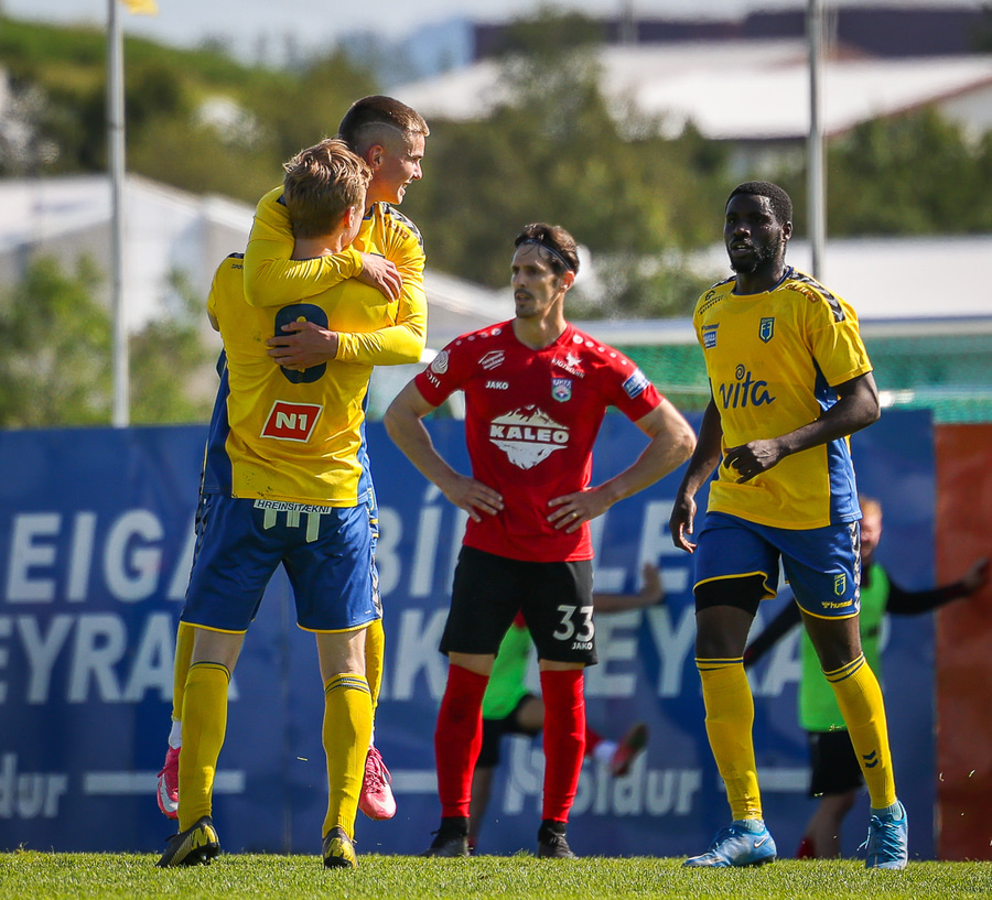 Pedro Vazquez með snögga aukaspyrnu sem Arnór Gauti nær að reka tærnar í á undan Sigurjóni. Boltinn yfir markið en besti séns gestanna til þessa.