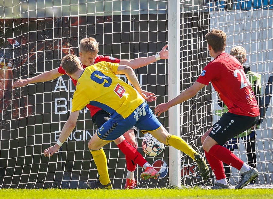 Rosalega þéttur pakki í markteig Aftureldingar eftir horn. Sýnist það vera Andri sem treður boltanum yfir línunna að lokum.