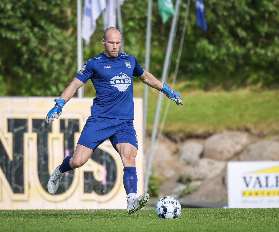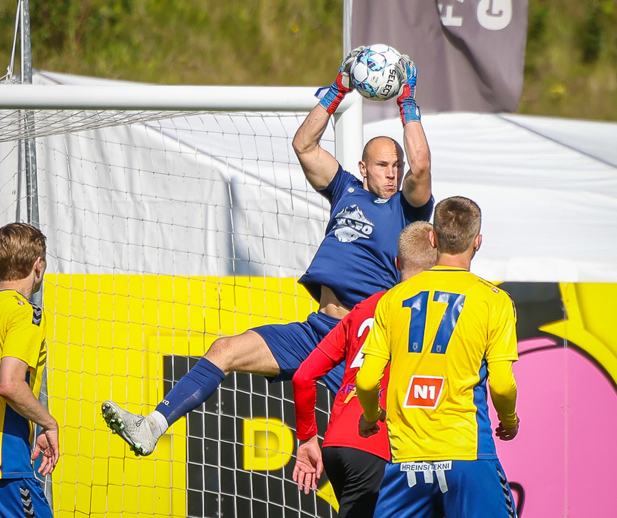 Gummi Kalli með hörkuskot sem Tanis ver vel.