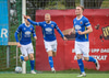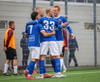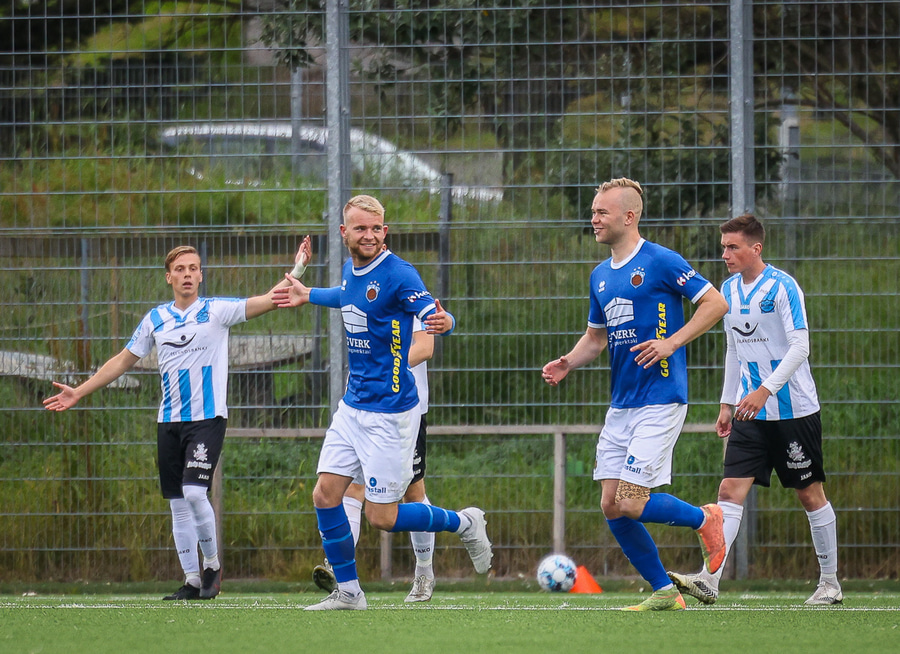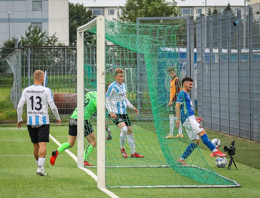 Kemur boltanum í netið af nærstöng, óverjandi fyrir Gunnar í markinu