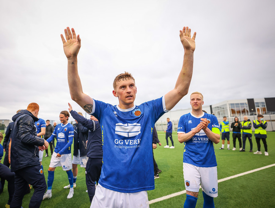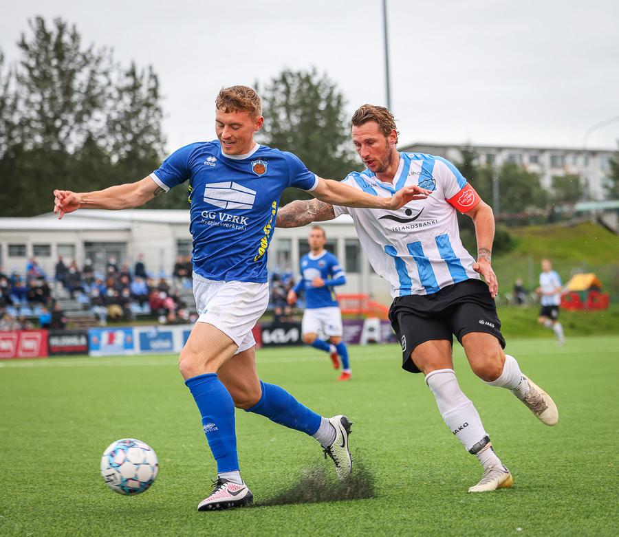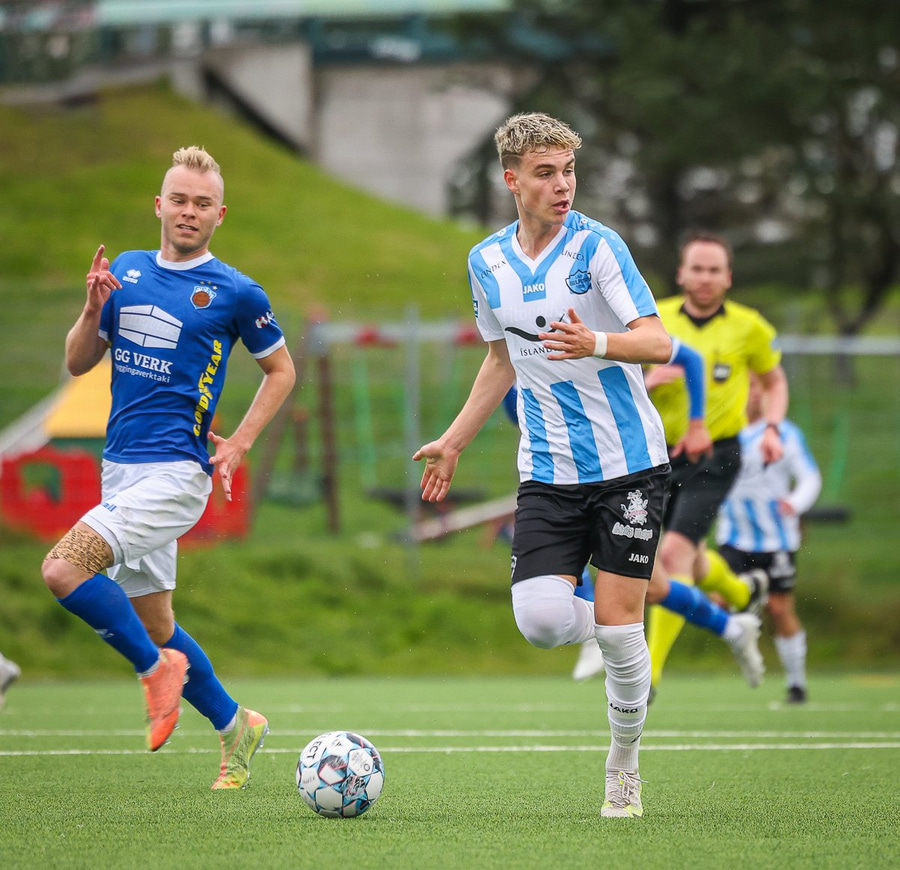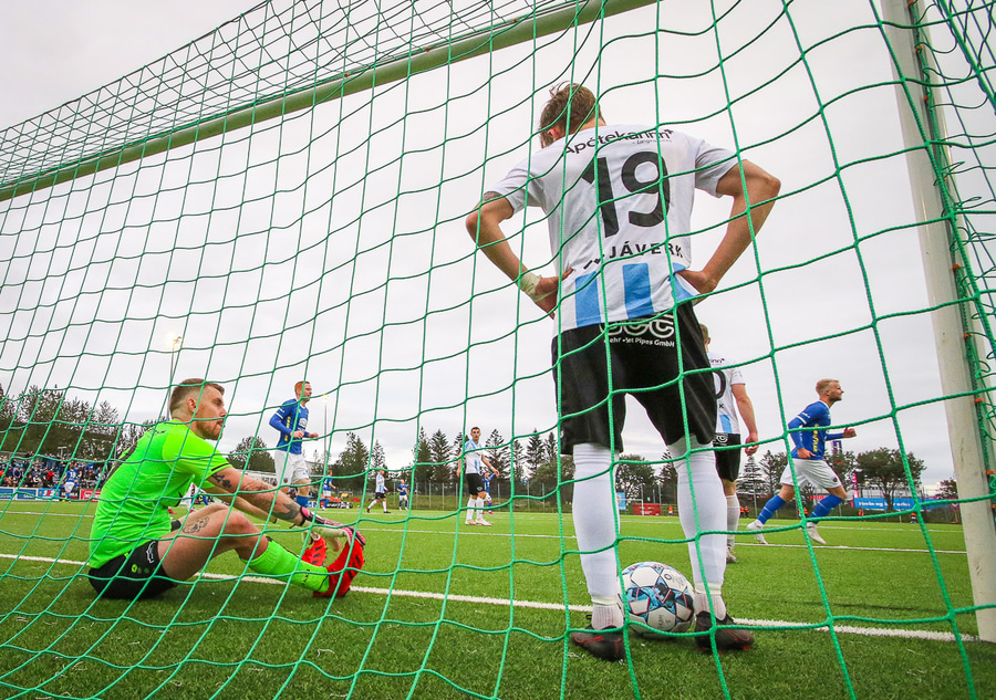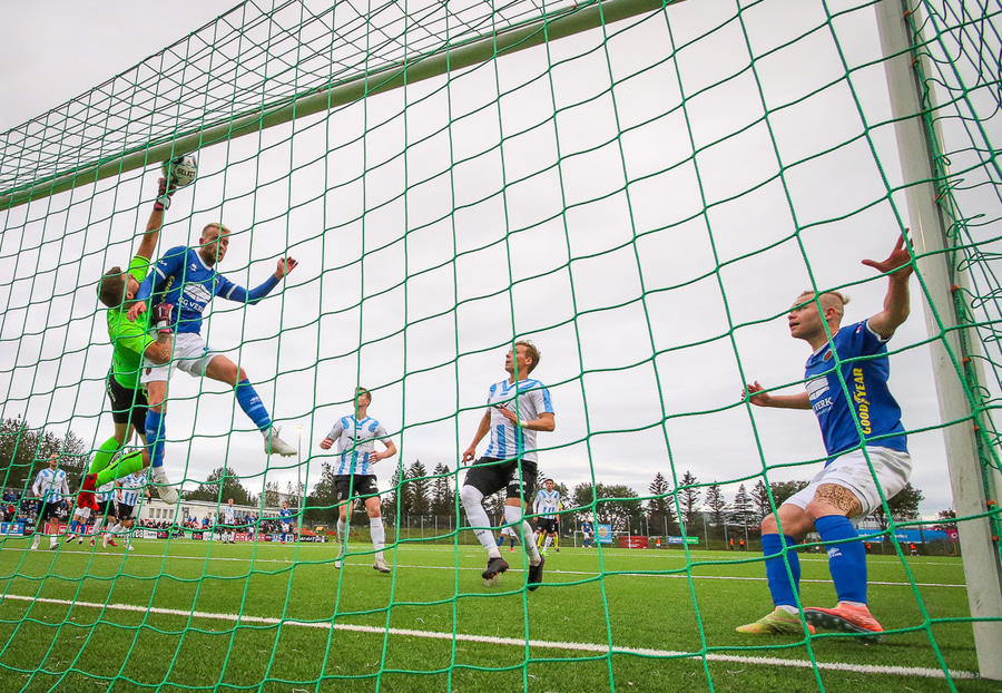 Ólafur Íshólm vel með á nótunum og spilar sem aftasti varnarmaður, kemur boltanum í burtu eftir langa sendingu innfyrir vörnina
