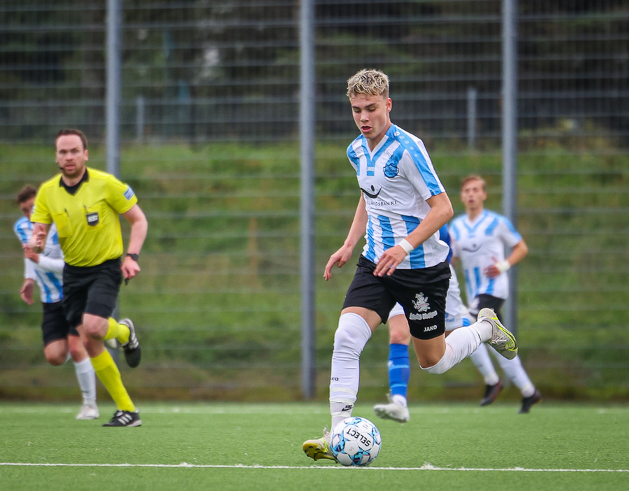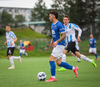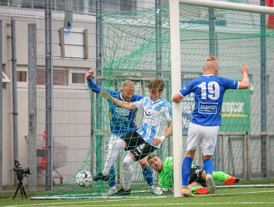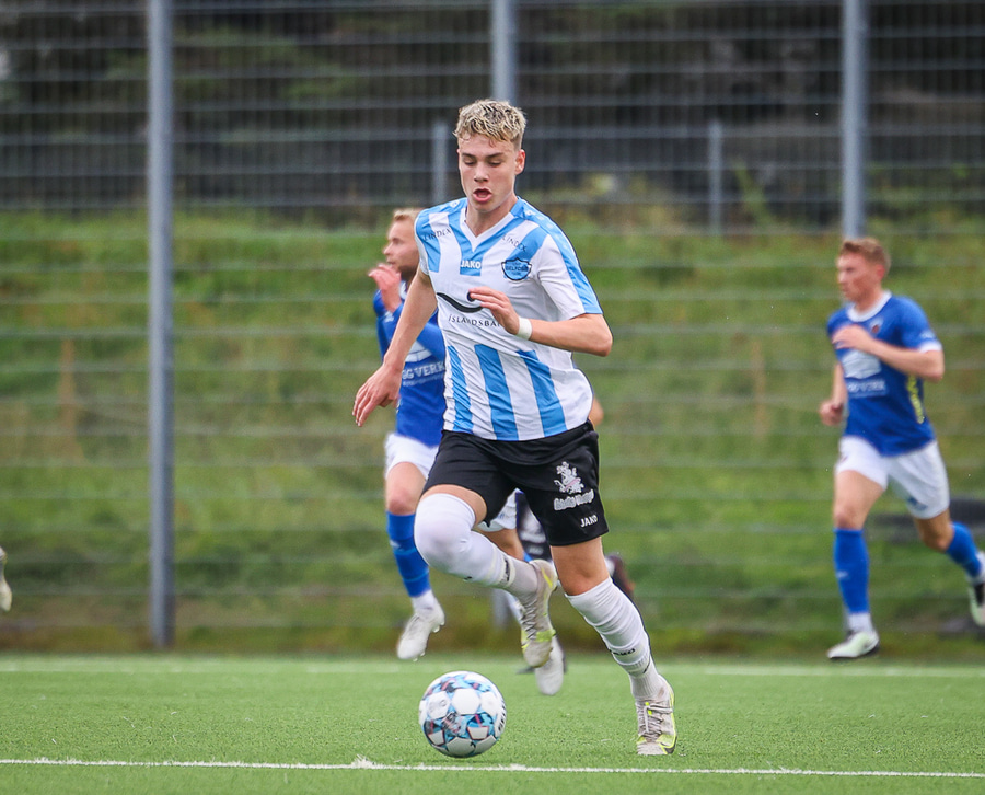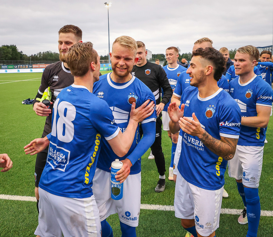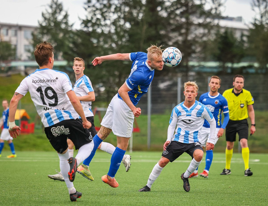 Ólafur Íshólm vel með á nótunum og spilar sem aftasti varnarmaður, kemur boltanum í burtu eftir langa sendingu innfyrir vörnina